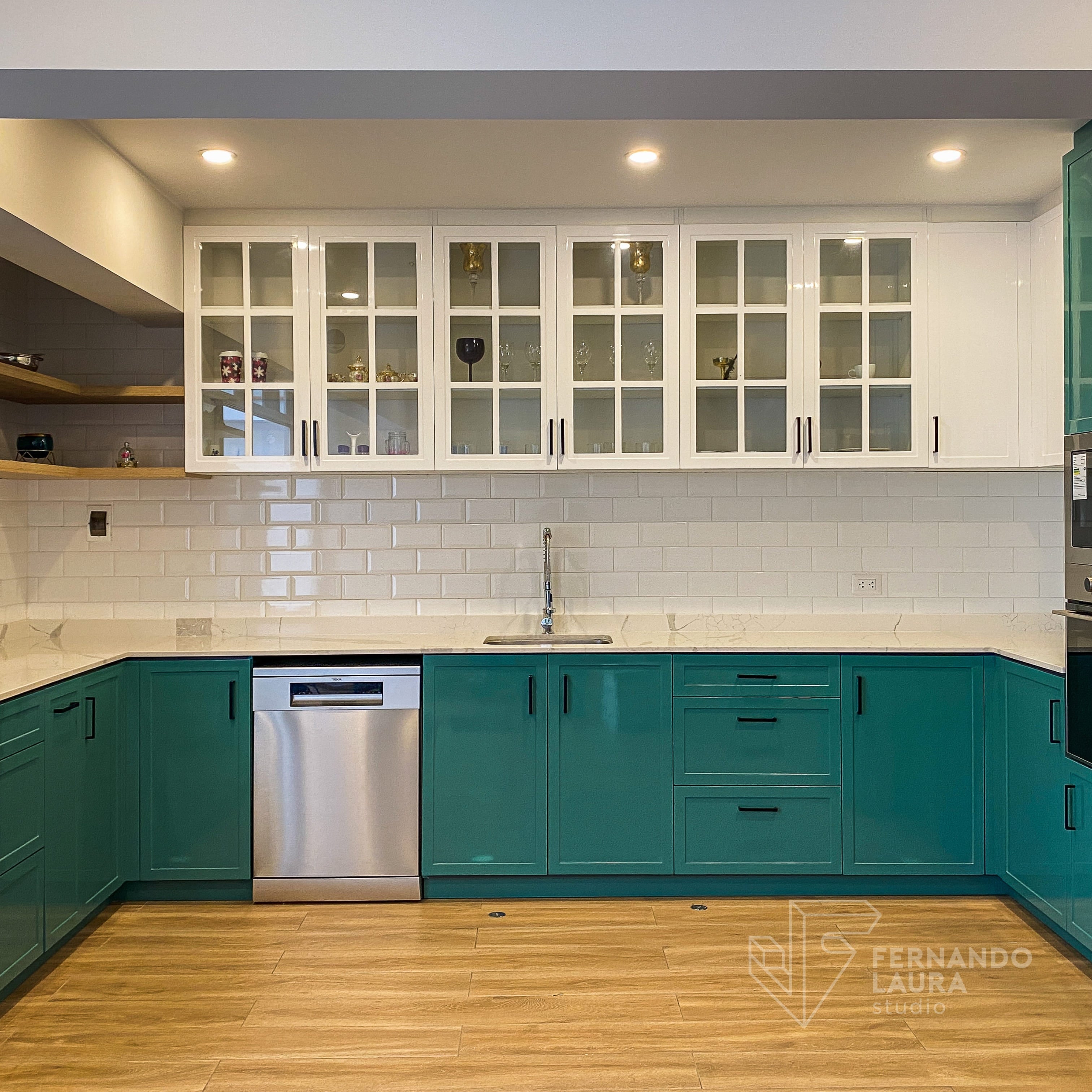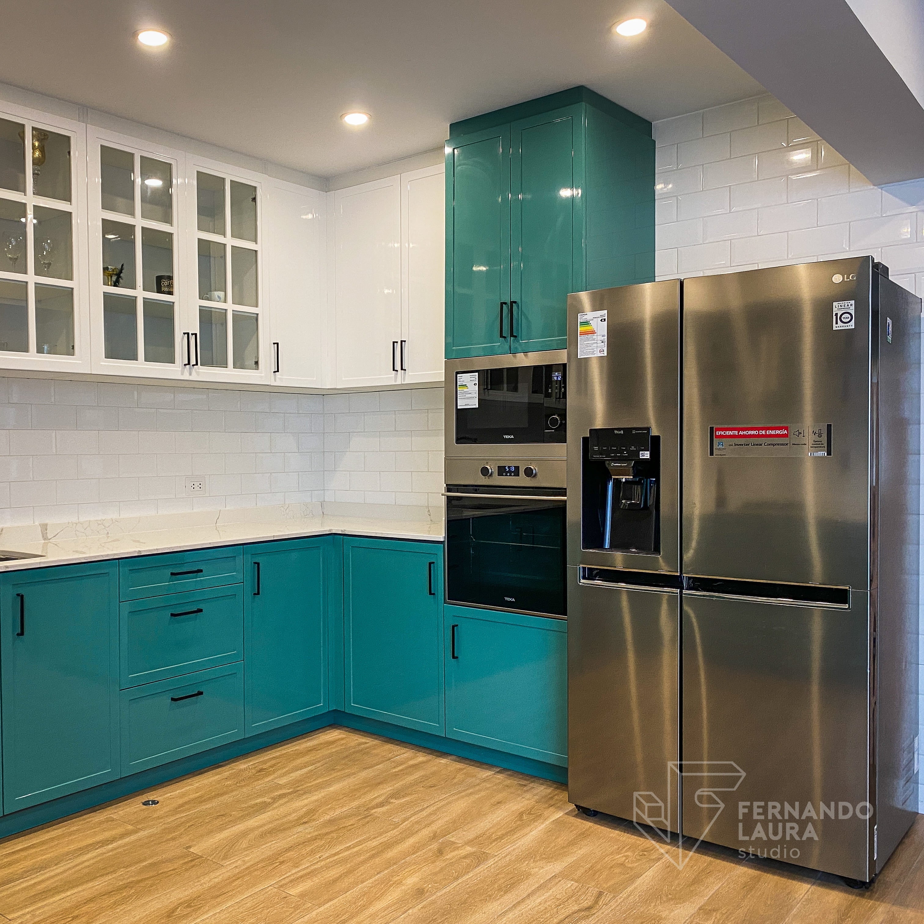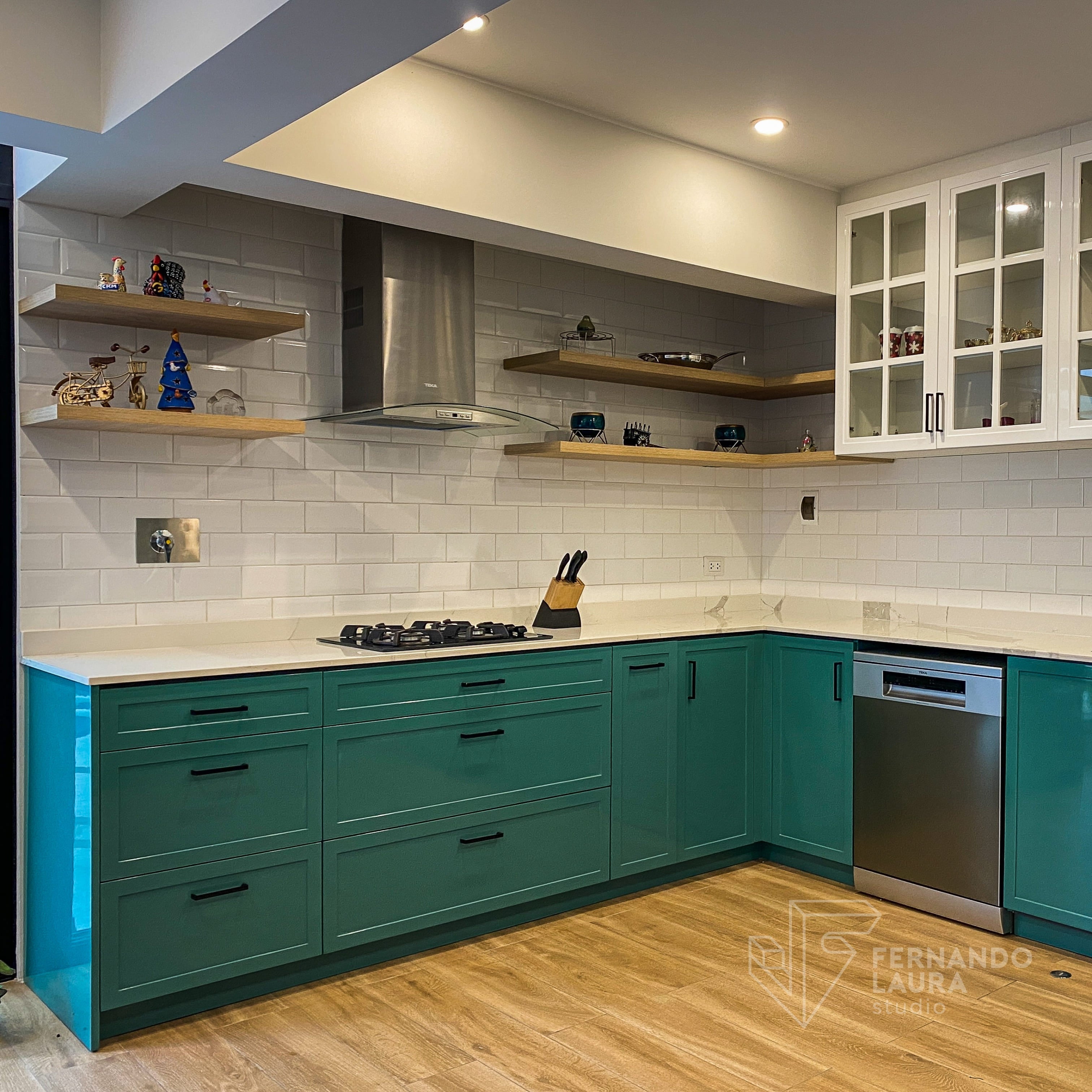 En esta amplia cocina en U de estilo contemporáneo y clásico moderno, utilizamos un color especial que se integraba con la paleta general del proyecto. El equipamiento incluye campana, placa a gas de 4 hornillas, poza de lavado, grifería, lavavajillas empotrado, y una torre de horno y microondas, todos de la marca Teka.
