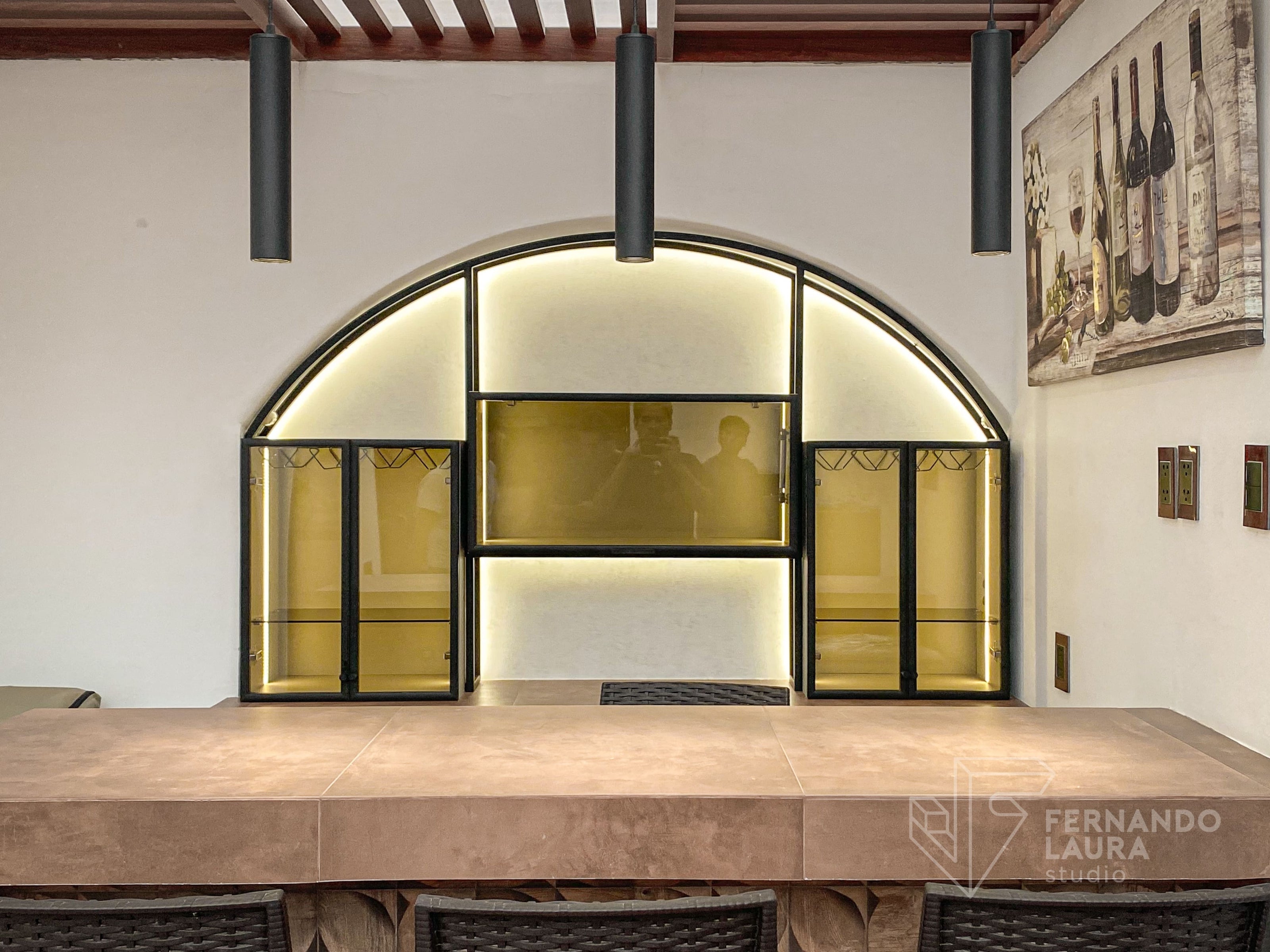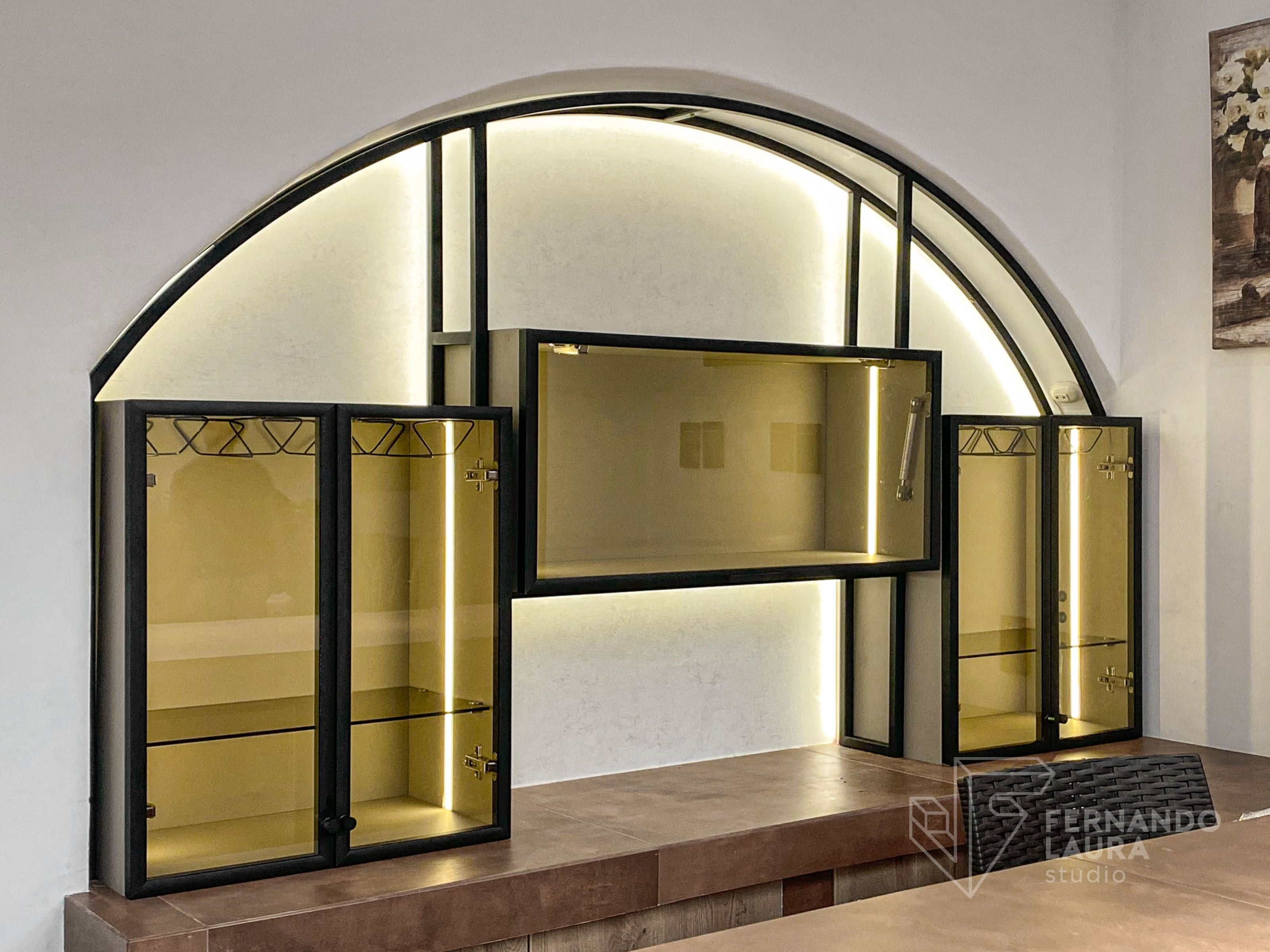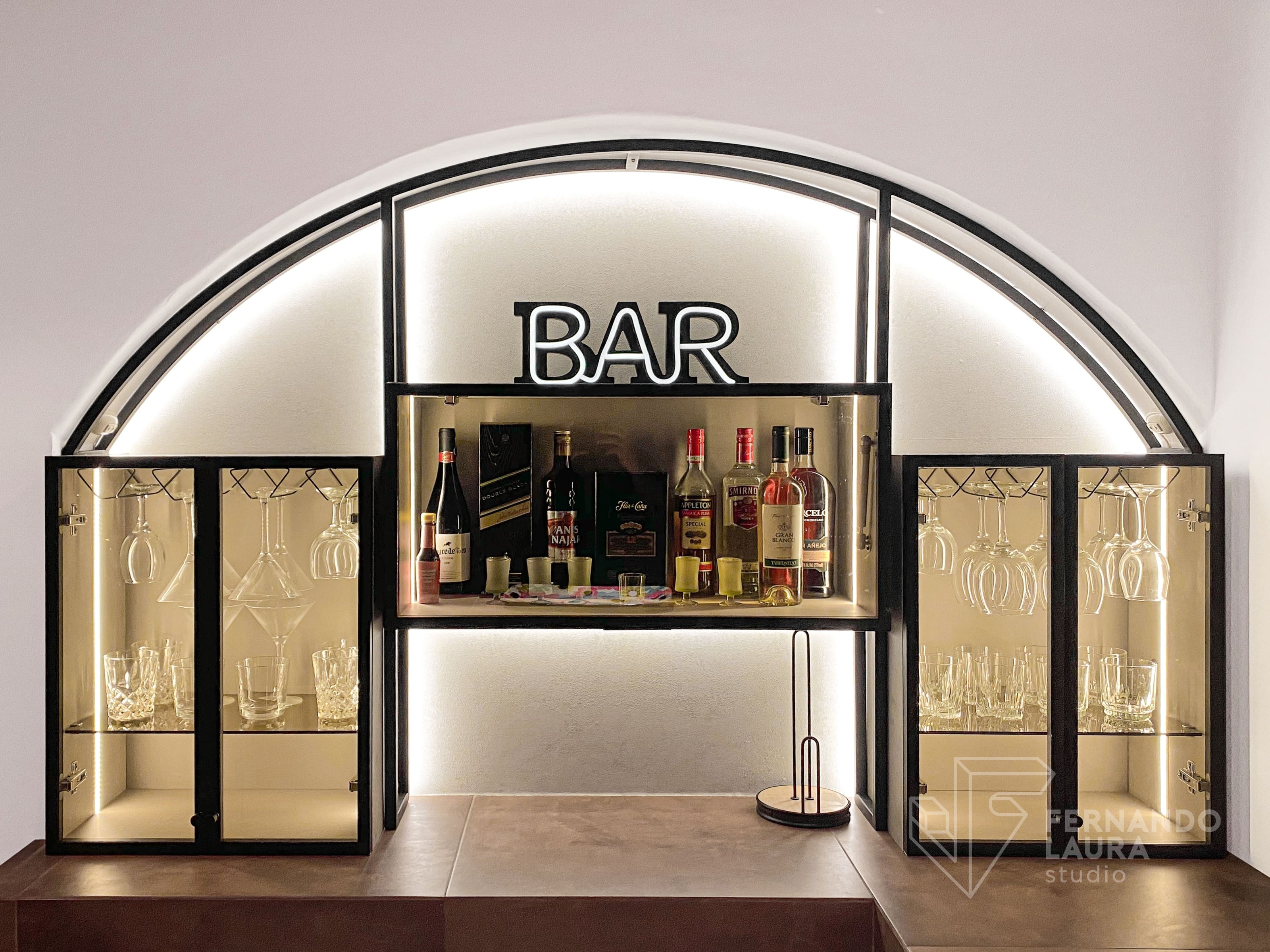 Diseñamos y fabricamos un mueble bar para una terraza, utilizando un área específica con una hornacina de arco de medio punto, donde la pared no podía ser perforada. Optamos por una estructura metálica que se asienta sobre el tablero, sosteniendo tres cubos de melamina Pelikano Taupe con puertas de vidrio tintado en bronce y marcos de aluminio negro. La composición se dividió en tres partes: los laterales para copas y vasos, y el centro para bebidas, con retroiluminación tanto en cada cubo como en la pared de fondo, que fue decorada con papel tapiz para destacar la iluminación.