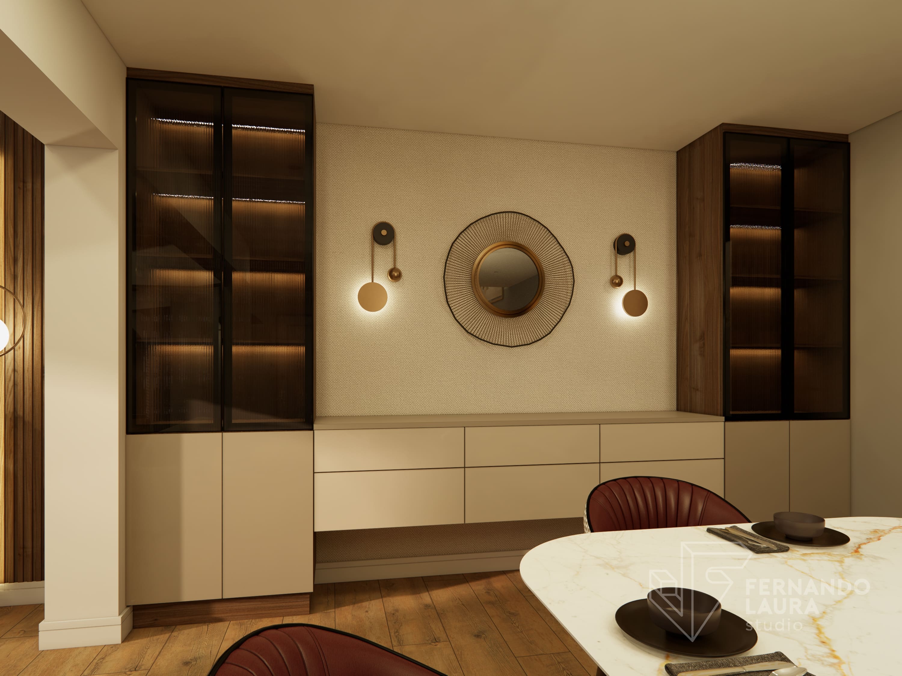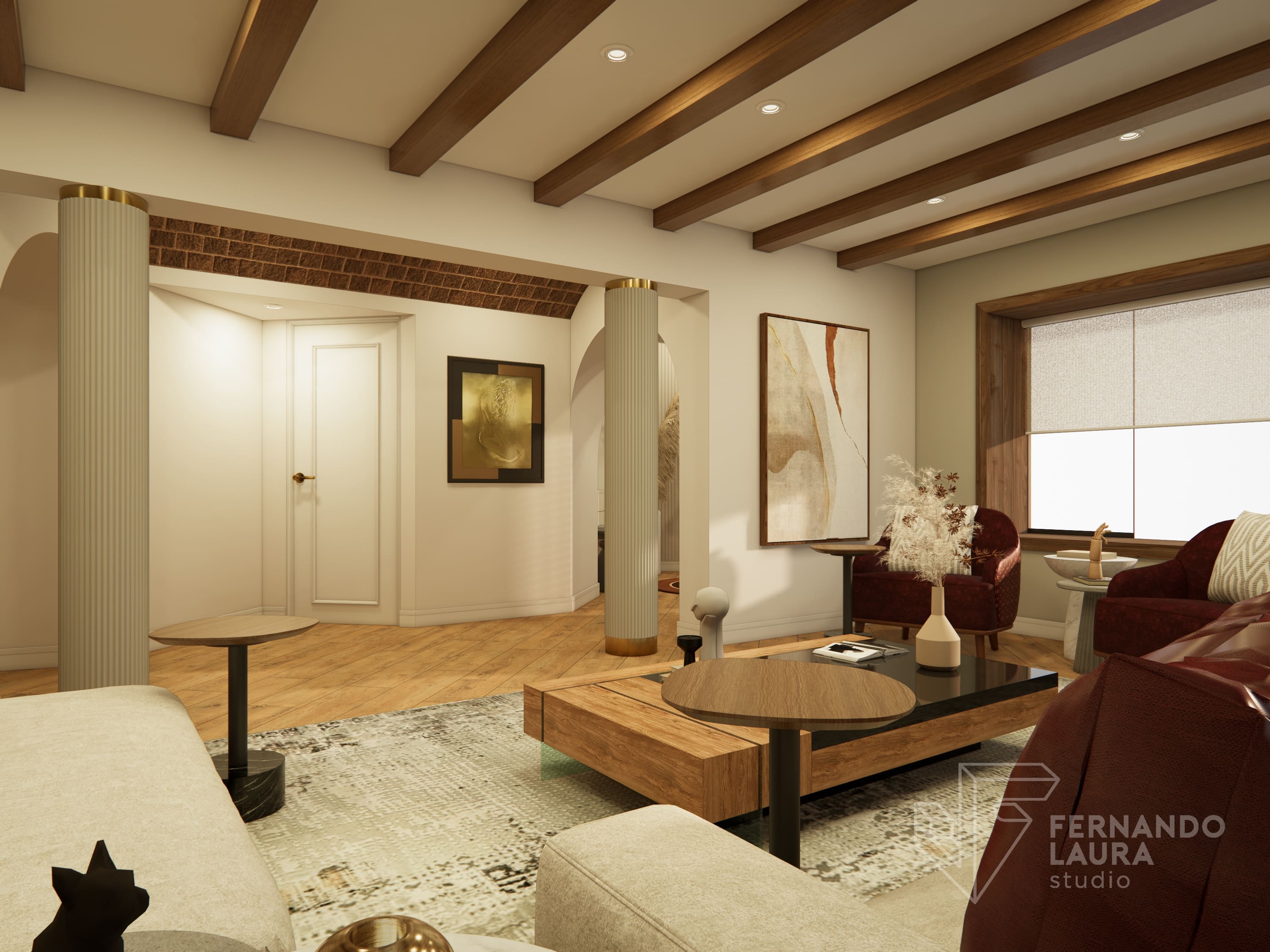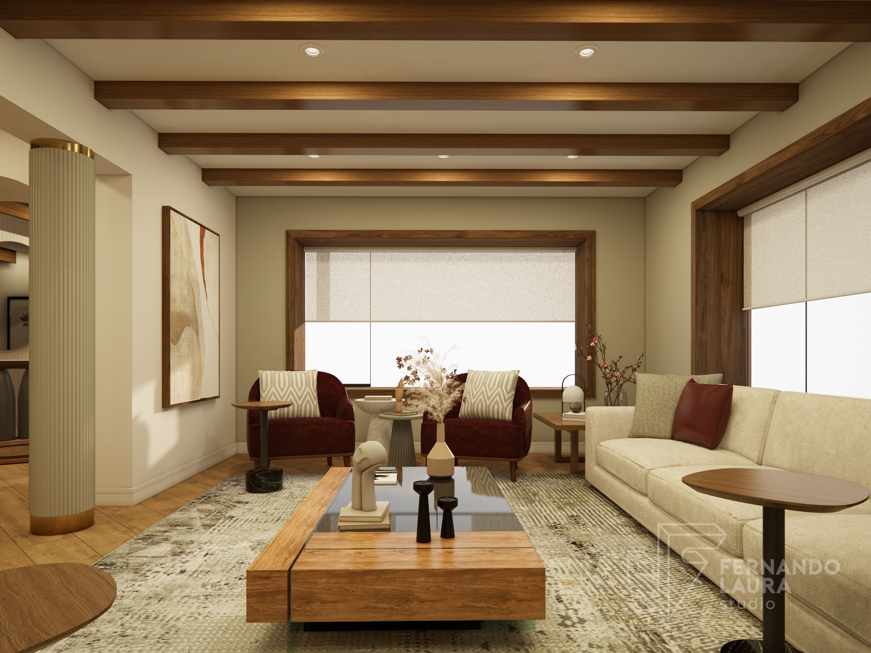 La propuesta de diseño integral combinó un estilo contemporáneo y moderno con una paleta de colores tierra y neutrales, acentuados con toques de color vino. El ingreso se transformó con un hermoso espejo orgánico retroiluminado y una consola de diseño exclusivo. En la sala principal, reutilizamos y mejoramos muebles existentes, como mesas de centro repintadas en dorado y sofás retapizados con telas de Deco Interiors.