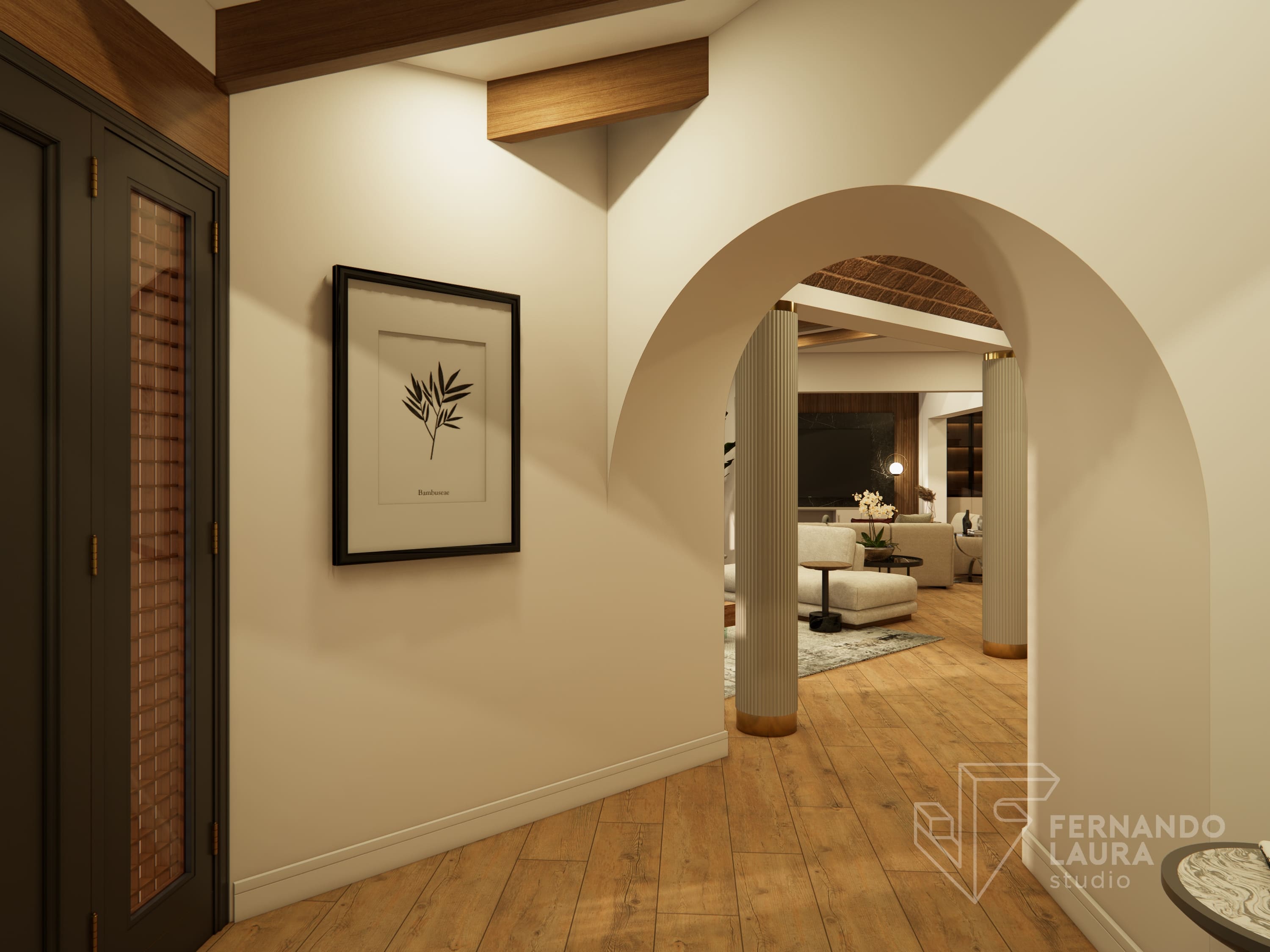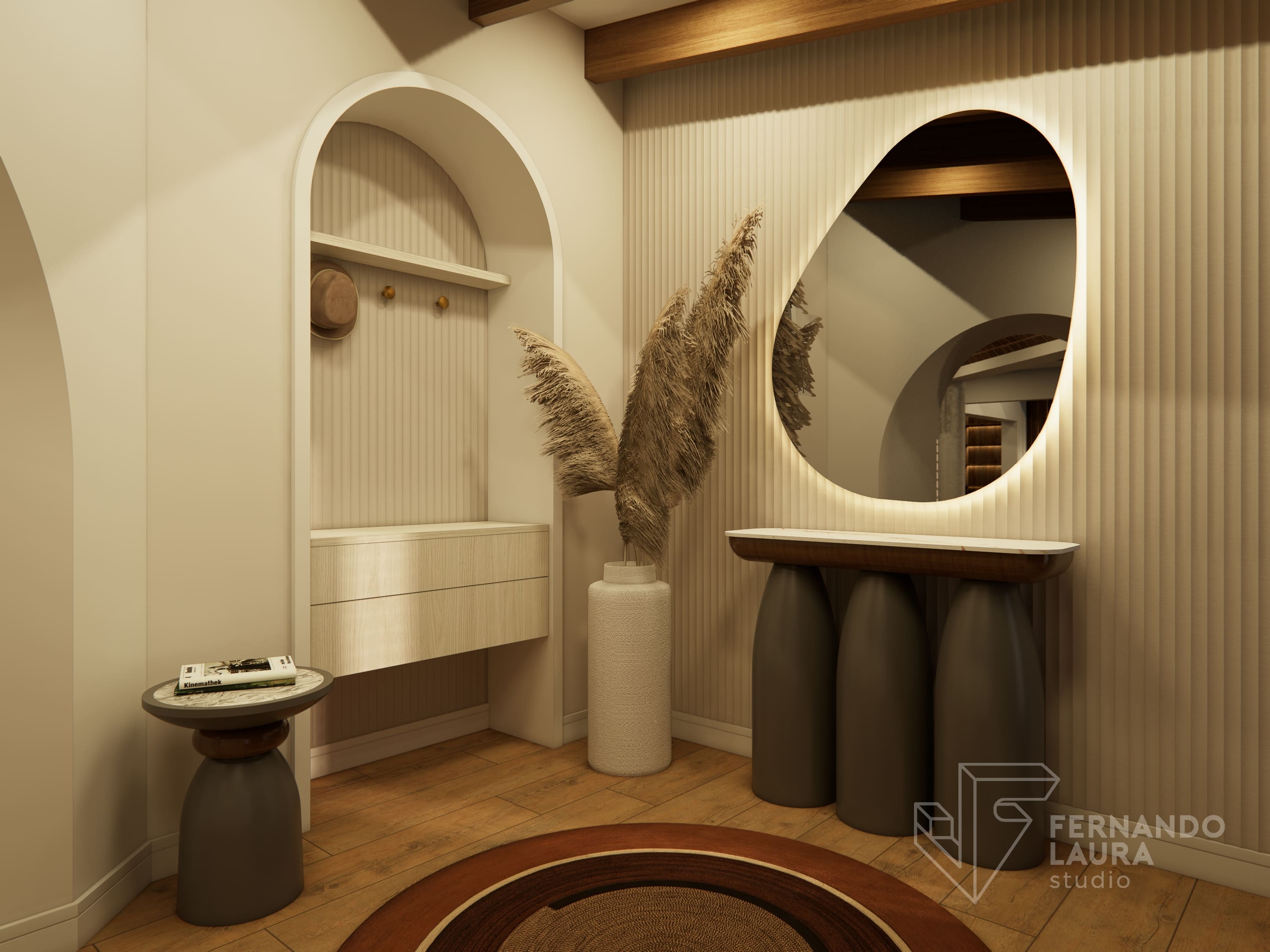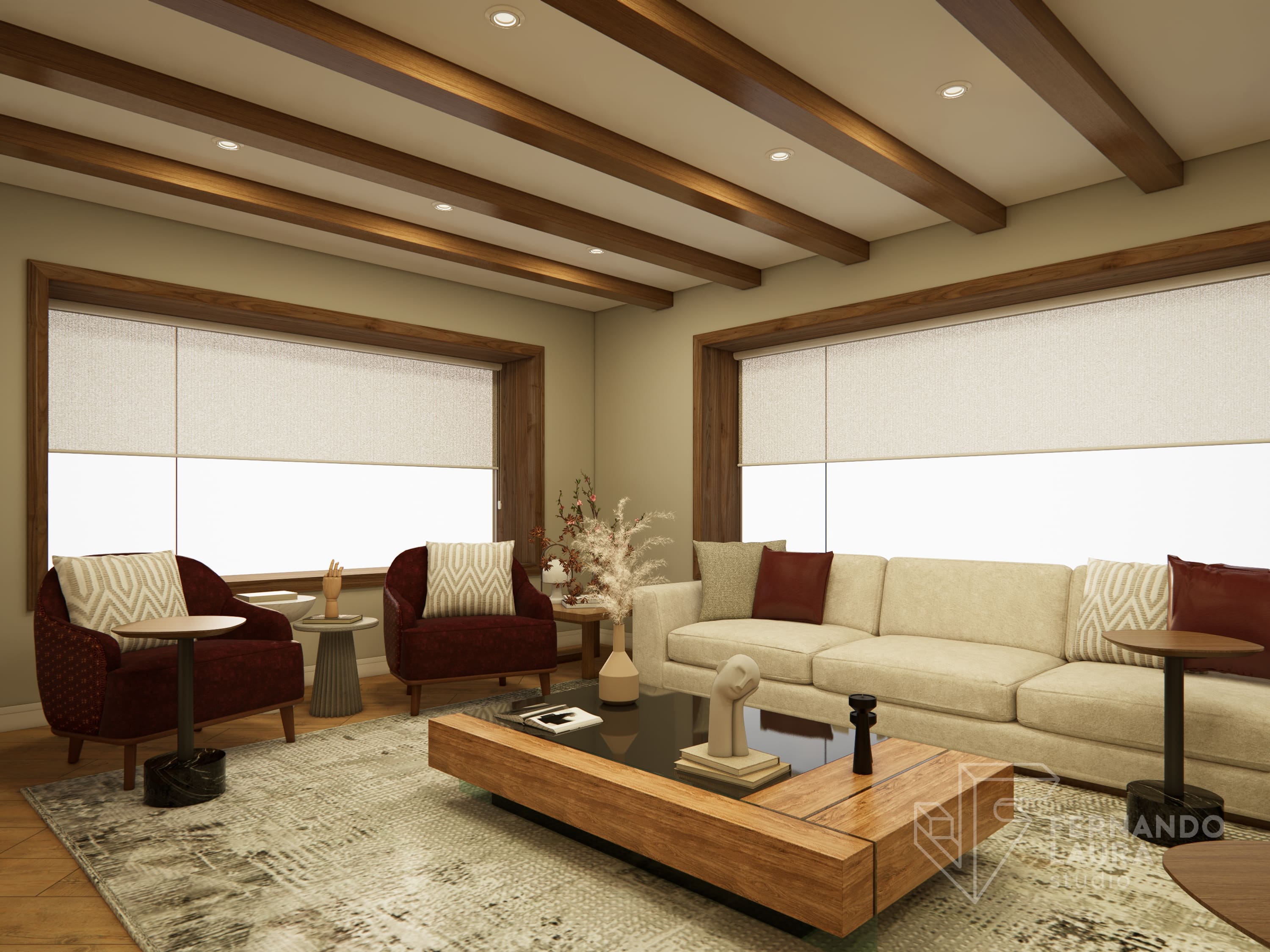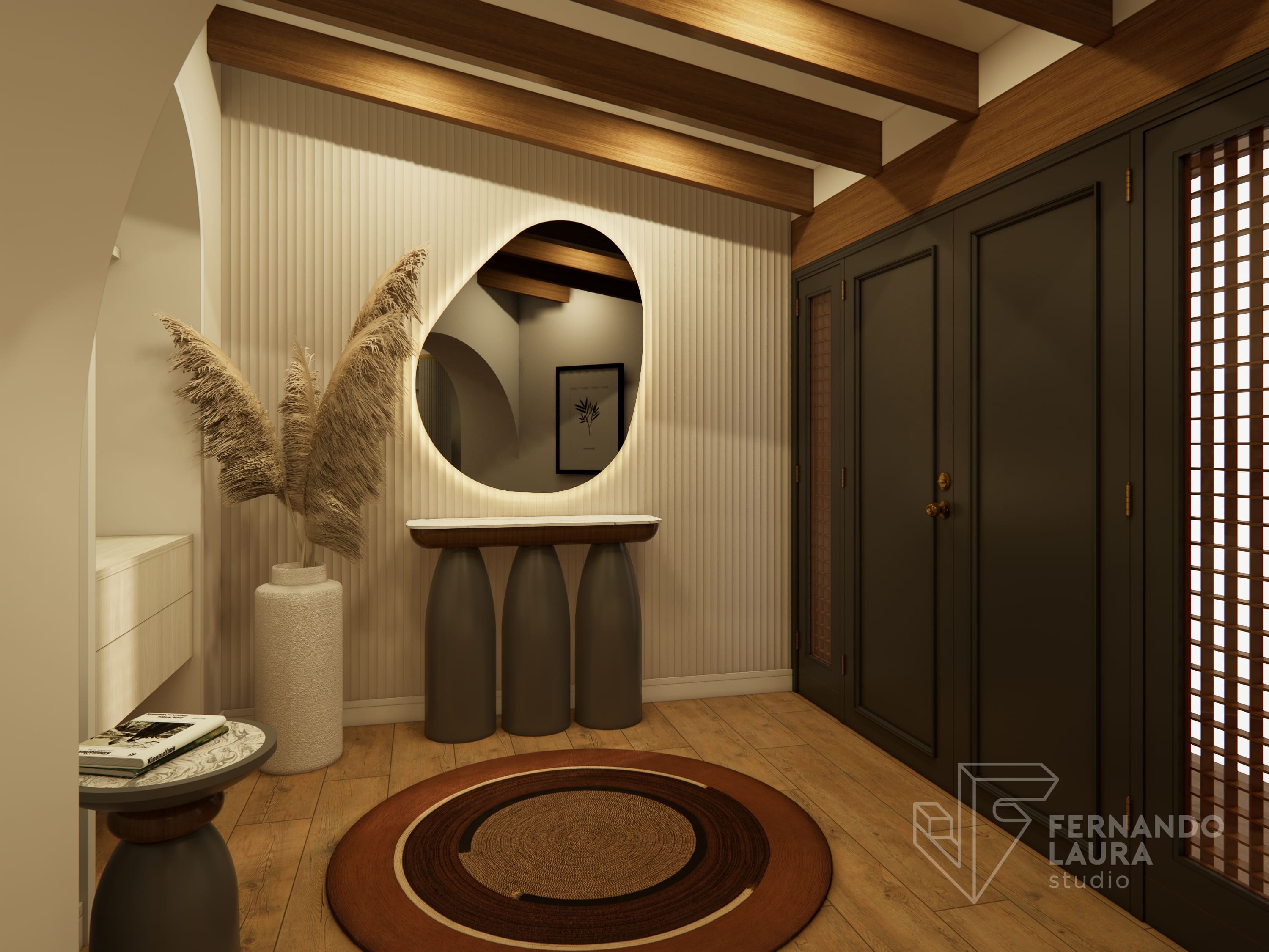 La propuesta de diseño integral combinó un estilo contemporáneo y moderno con una paleta de colores tierra y neutrales, acentuados con toques de color vino. El ingreso se transformó con un hermoso espejo orgánico retroiluminado y una consola de diseño exclusivo. En la sala principal, reutilizamos y mejoramos muebles existentes, como mesas de centro repintadas en dorado y sofás retapizados con telas de Deco Interiors.