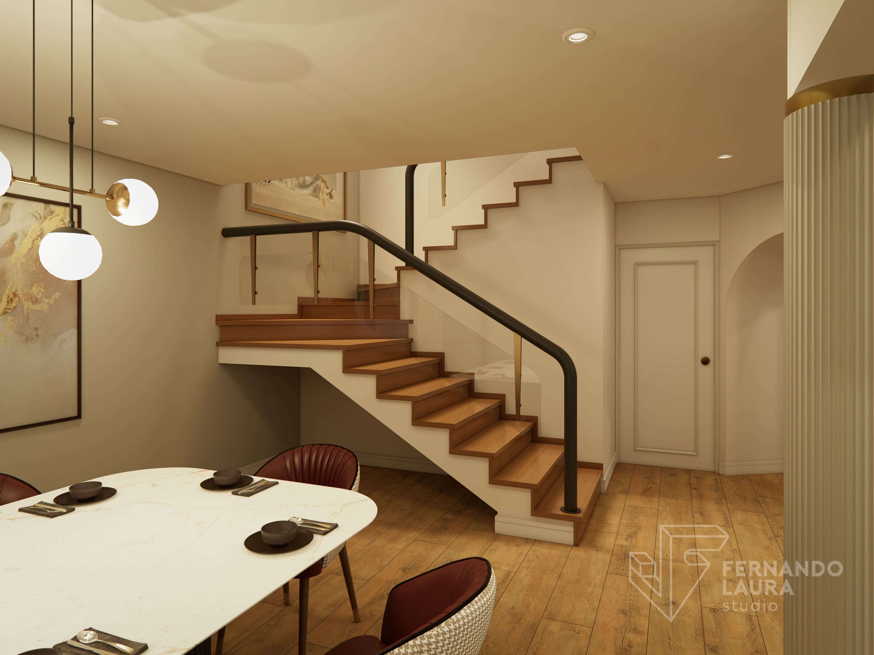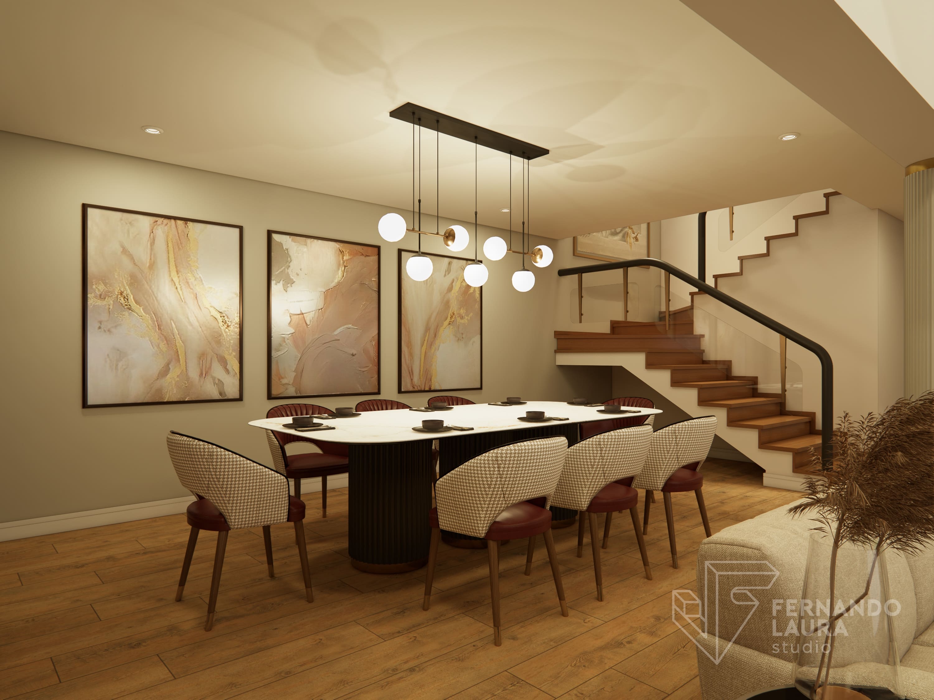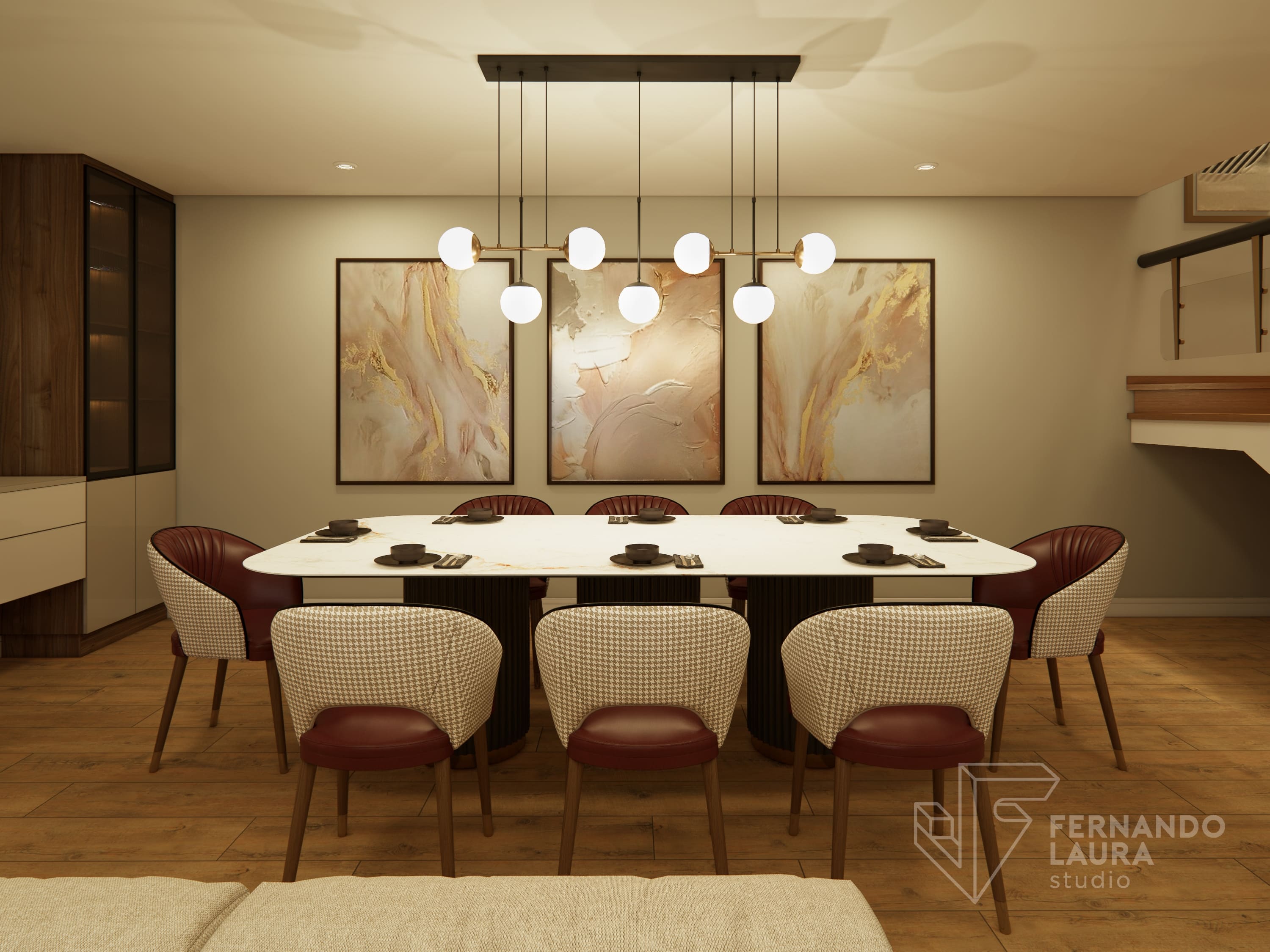 La sala de estar cuenta con un mueble de TV de doble altura, con panel de piedra negro Marquina sobre un wallpanel amaderado de Unidesign, y luminarias colgantes de Led Design. En el comedor, una mesa de piedra sinterizada de InPiedra es el punto focal, rodeada de sillas tapizadas con telas exclusivas y una luminaria colgante de Eglo. Dos torres retroiluminadas con puertas de efecto vidrio acanalado añaden un toque de lujo. La escalera se renovó con barandas pintadas y apliques dorados, complementados por un destacado trabajo de arte en el fondo, creando una cohesiva y elegante presentación.