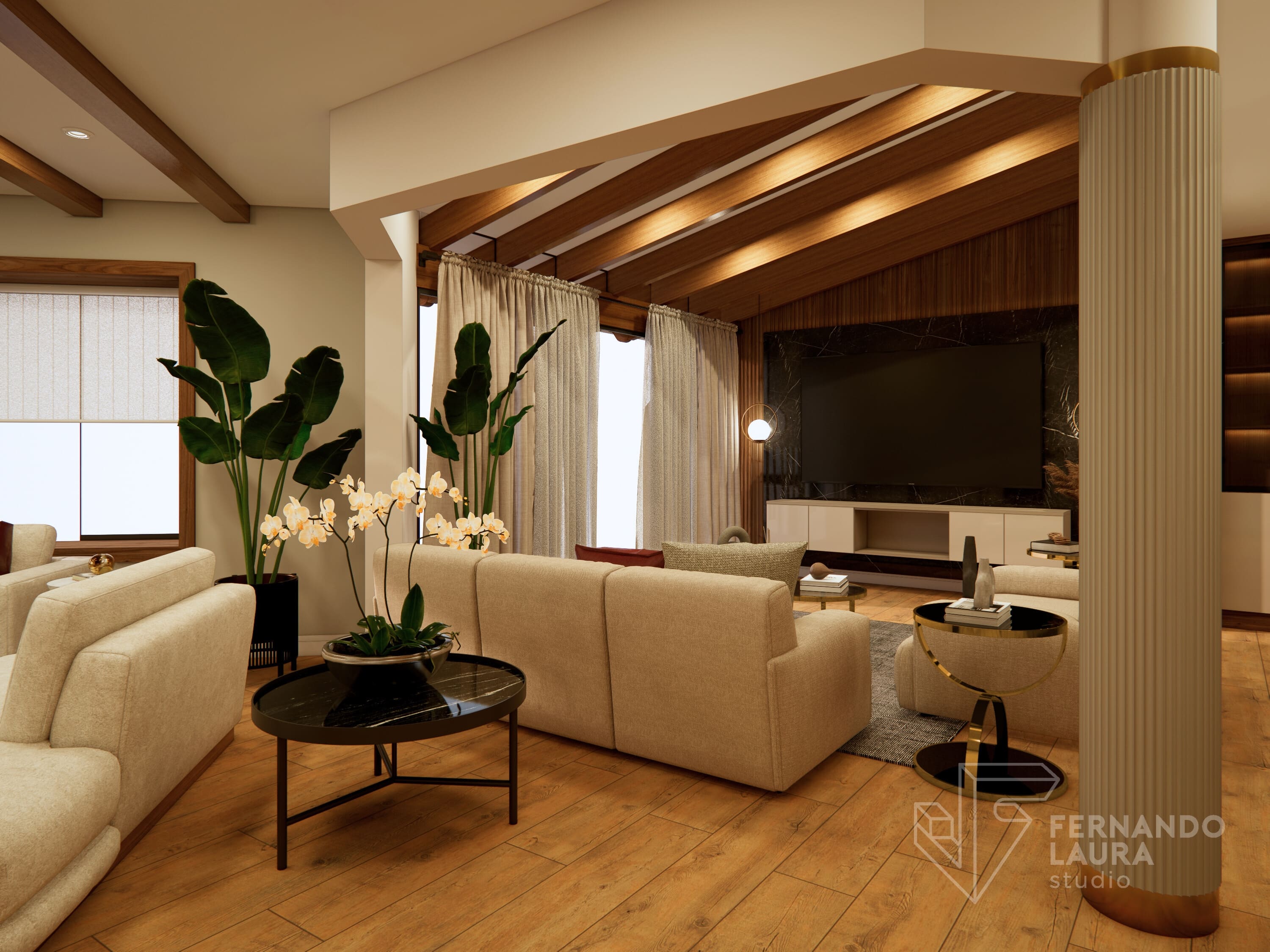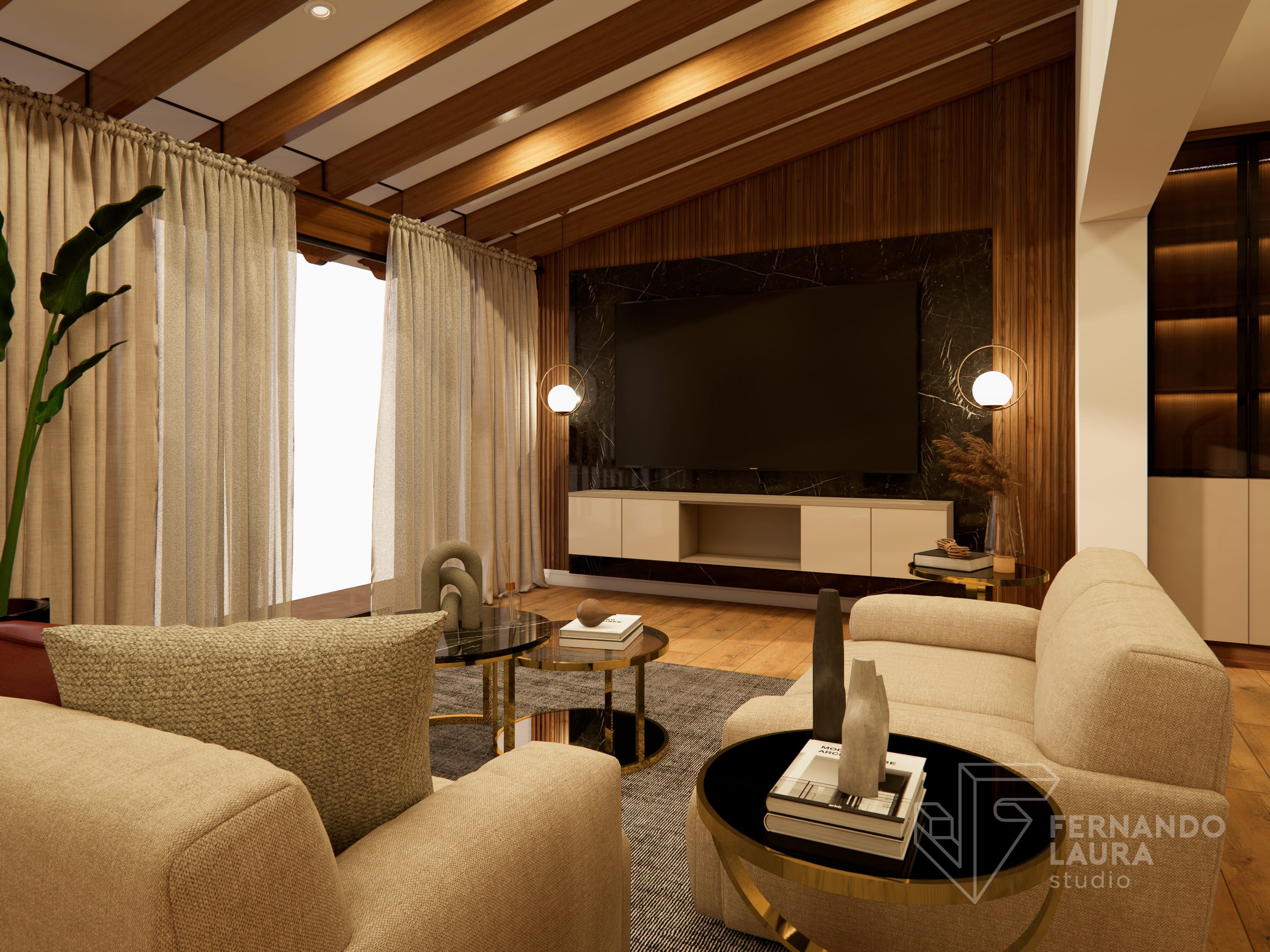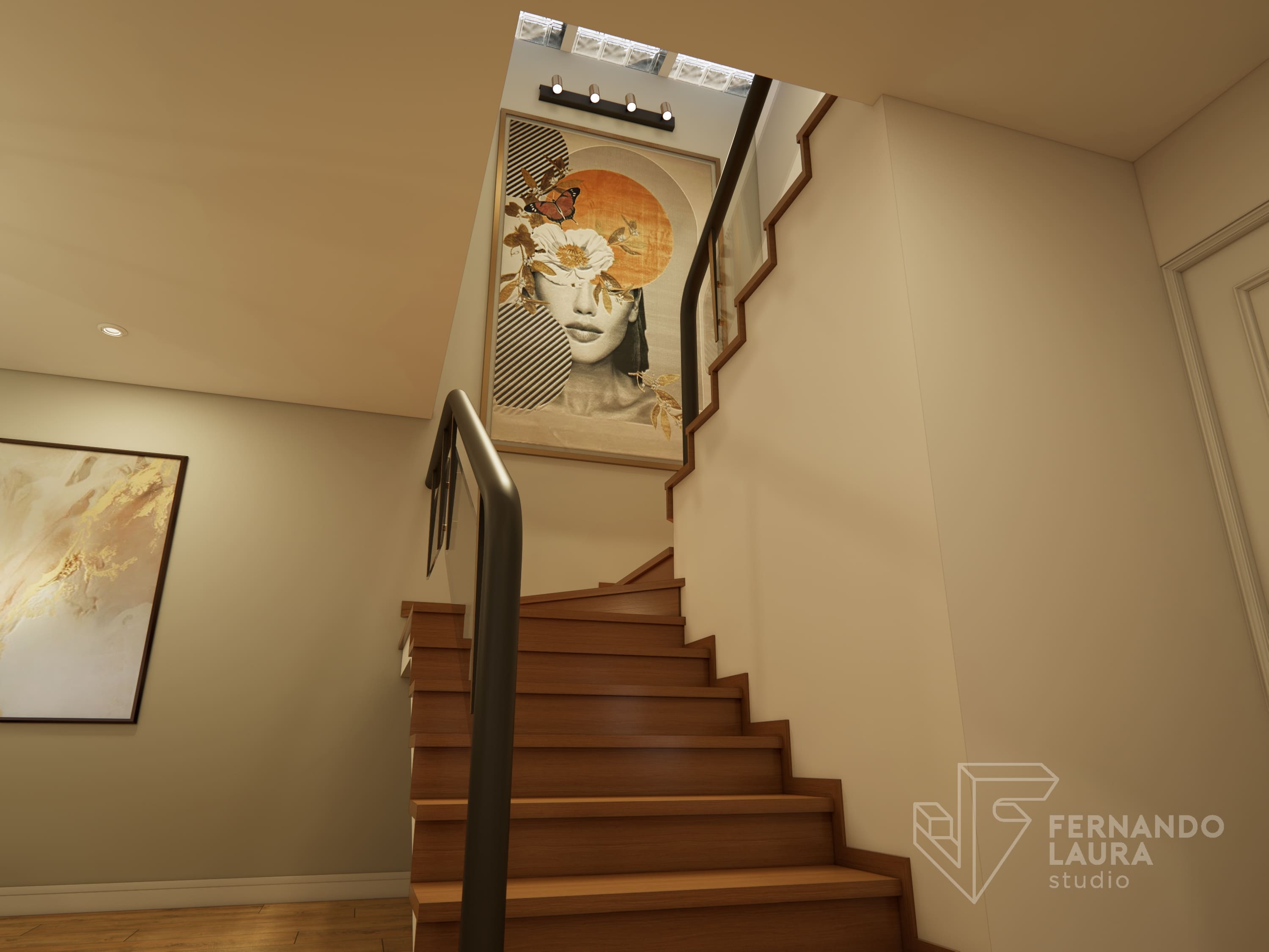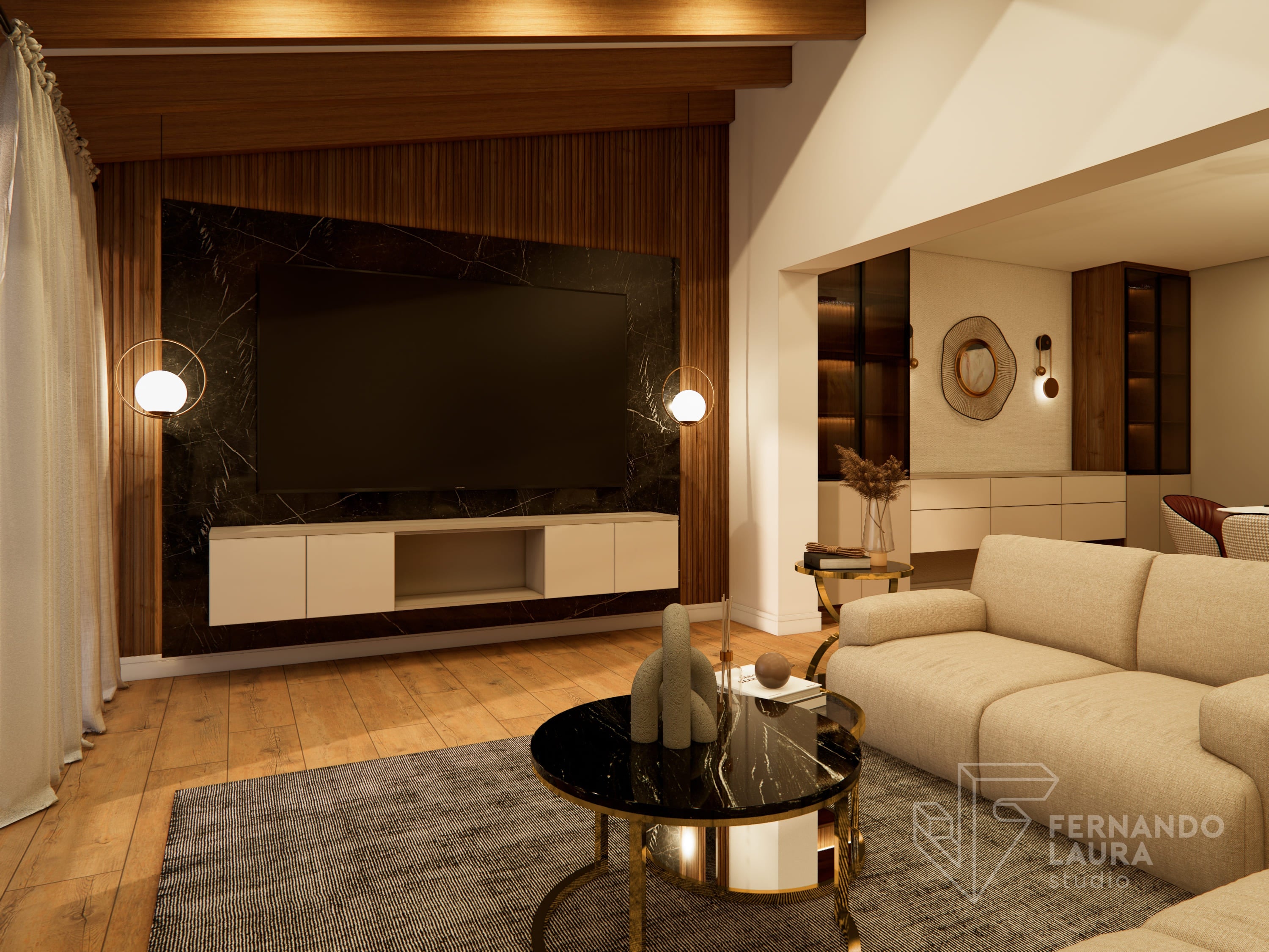 La sala de estar cuenta con un mueble de TV de doble altura, con panel de piedra negro Marquina sobre un wallpanel amaderado de Unidesign, y luminarias colgantes de Led Design. En el comedor, una mesa de piedra sinterizada de InPiedra es el punto focal, rodeada de sillas tapizadas con telas exclusivas y una luminaria colgante de Eglo. Dos torres retroiluminadas con puertas de efecto vidrio acanalado añaden un toque de lujo. La escalera se renovó con barandas pintadas y apliques dorados, complementados por un destacado trabajo de arte en el fondo, creando una cohesiva y elegante presentación.