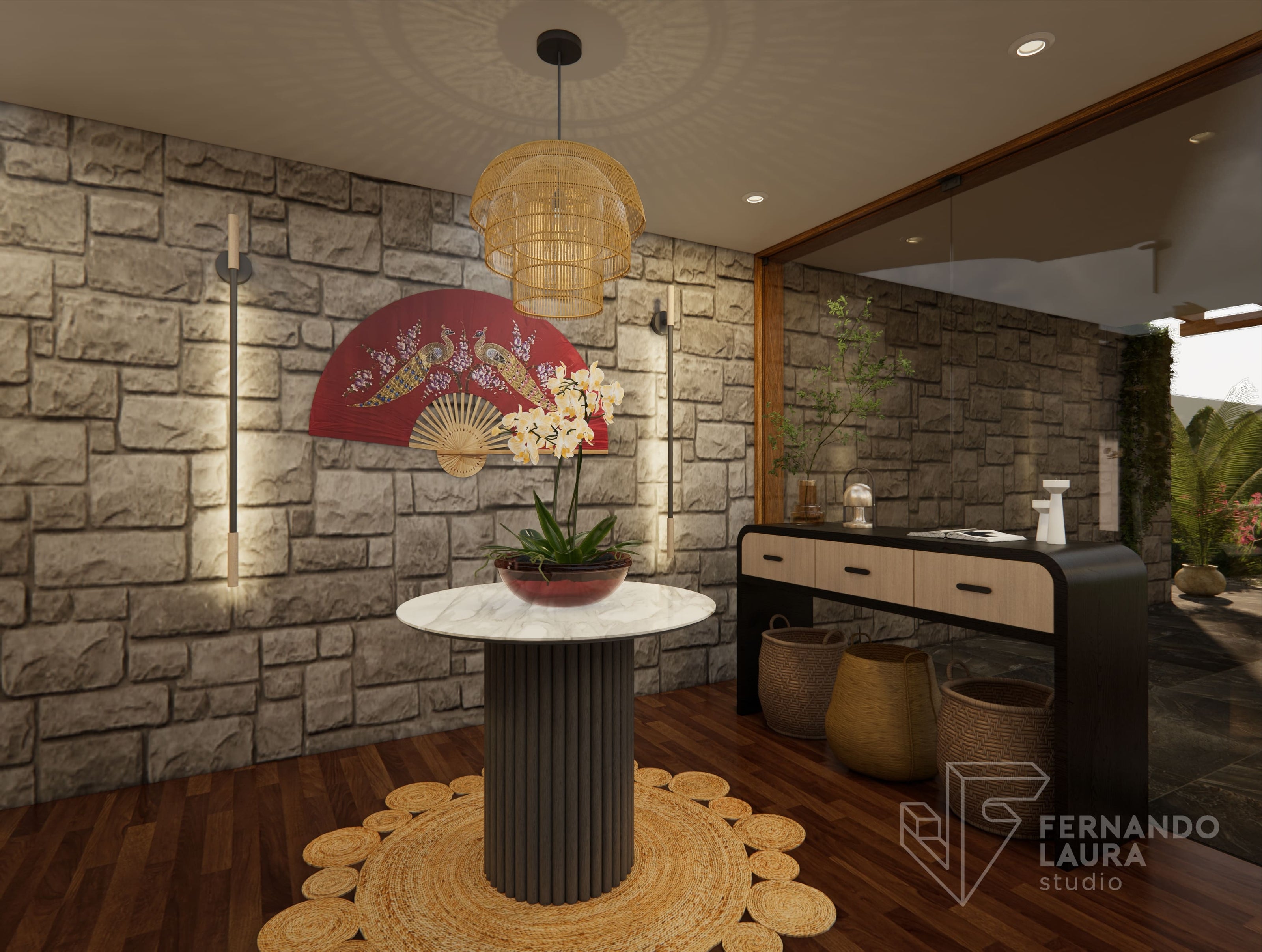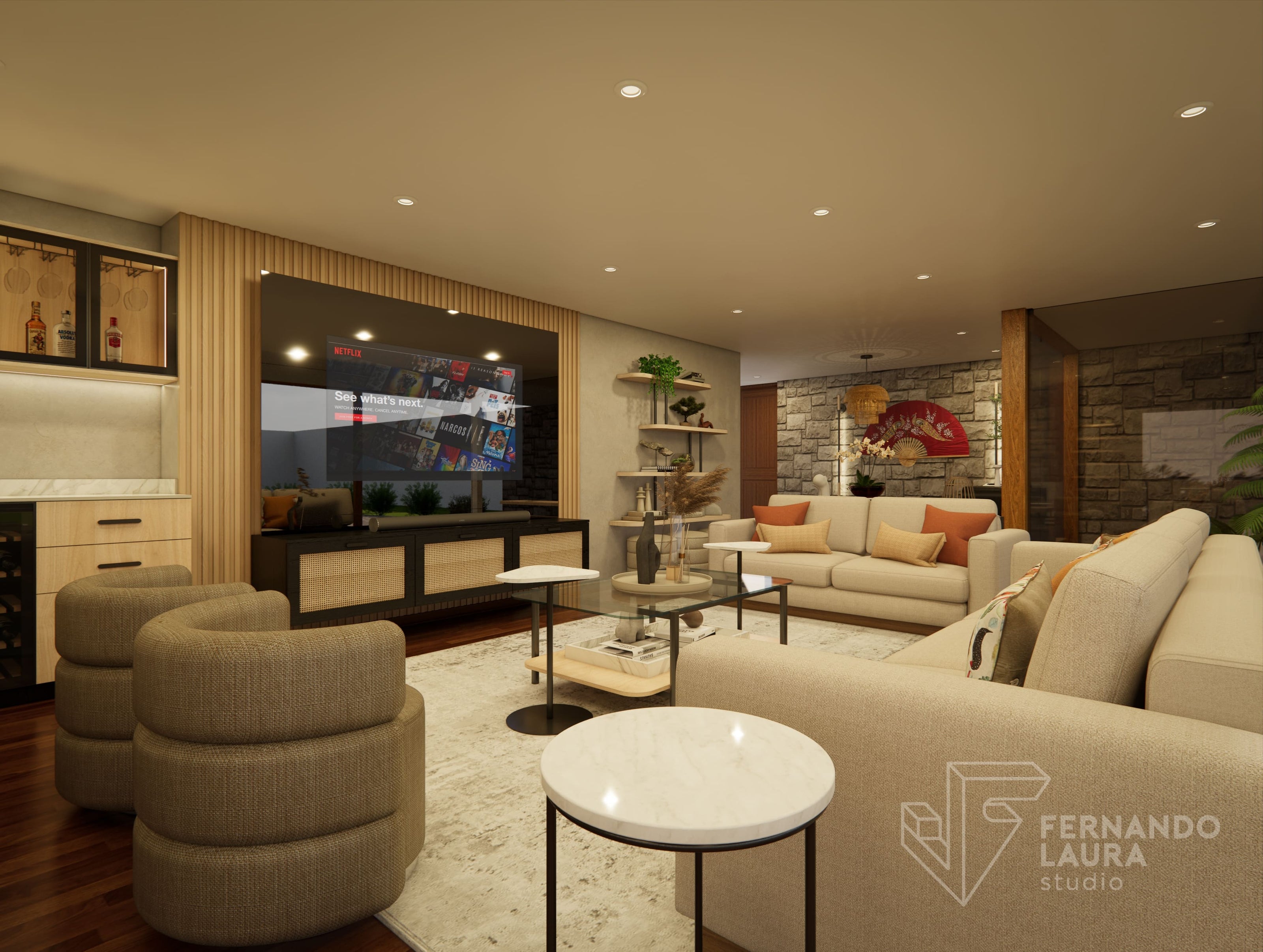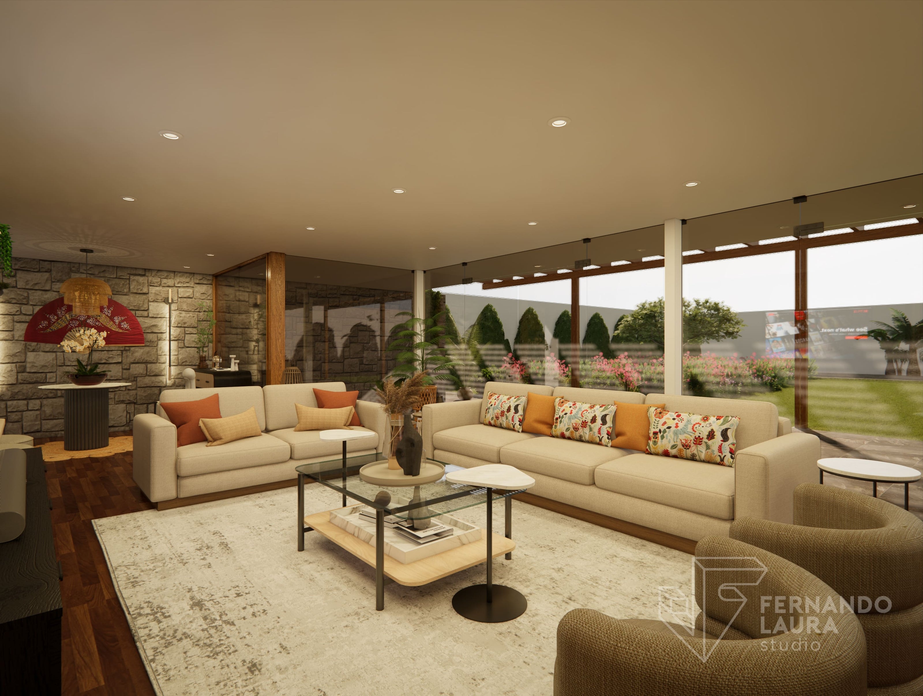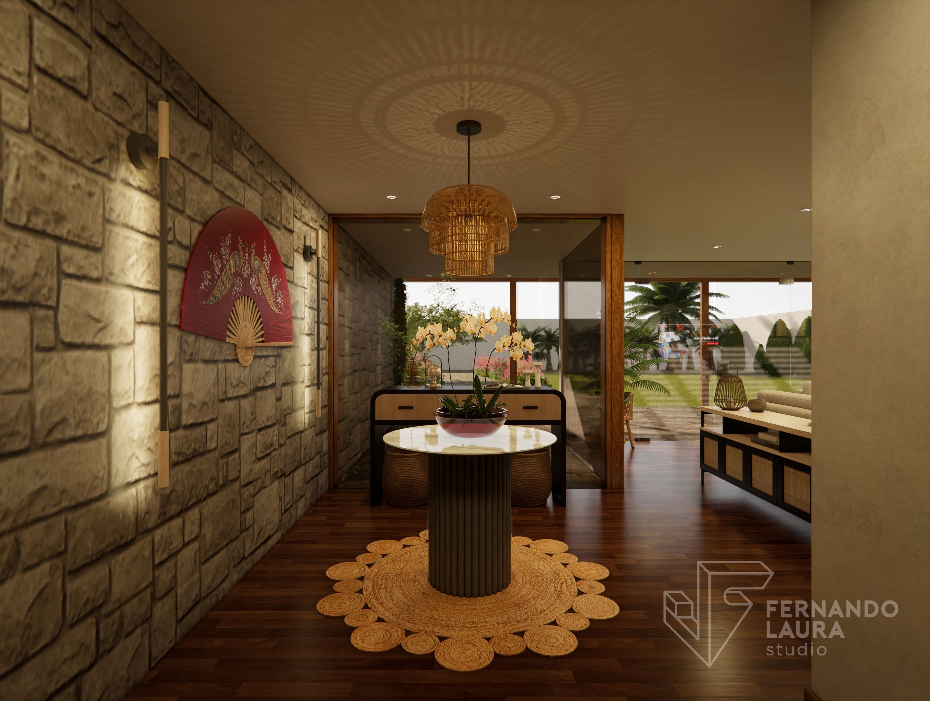 Trabajamos en una casa de campo en Lurigancho-Chosica, interviniendo un área de 79.90m² que abarcó los espacios de ingreso, sala y comedor. El diseño propuesto fue rústico moderno, utilizando una paleta de colores tierra, amaderados y negros para aportar elegancia y crear equilibrio visual con el piso existente y los acabados de piedra en las paredes. La decoración vibrante reflejó los viajes de la clienta alrededor del mundo.