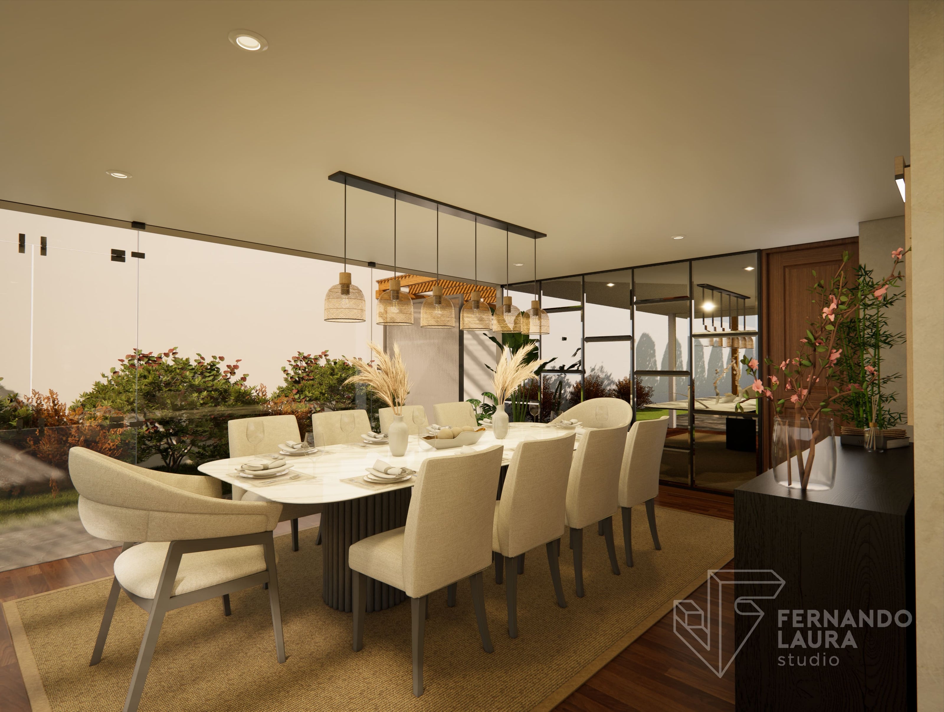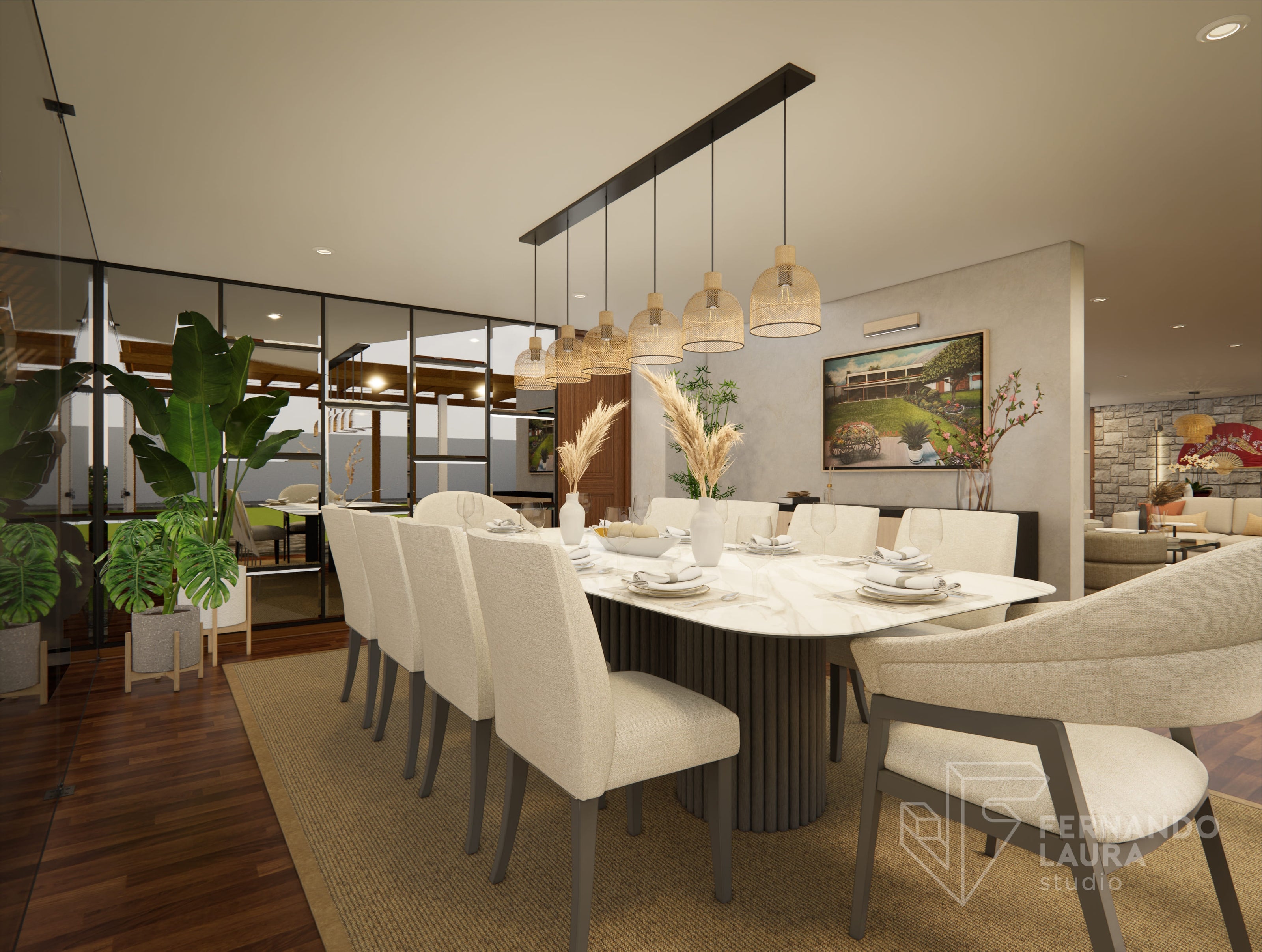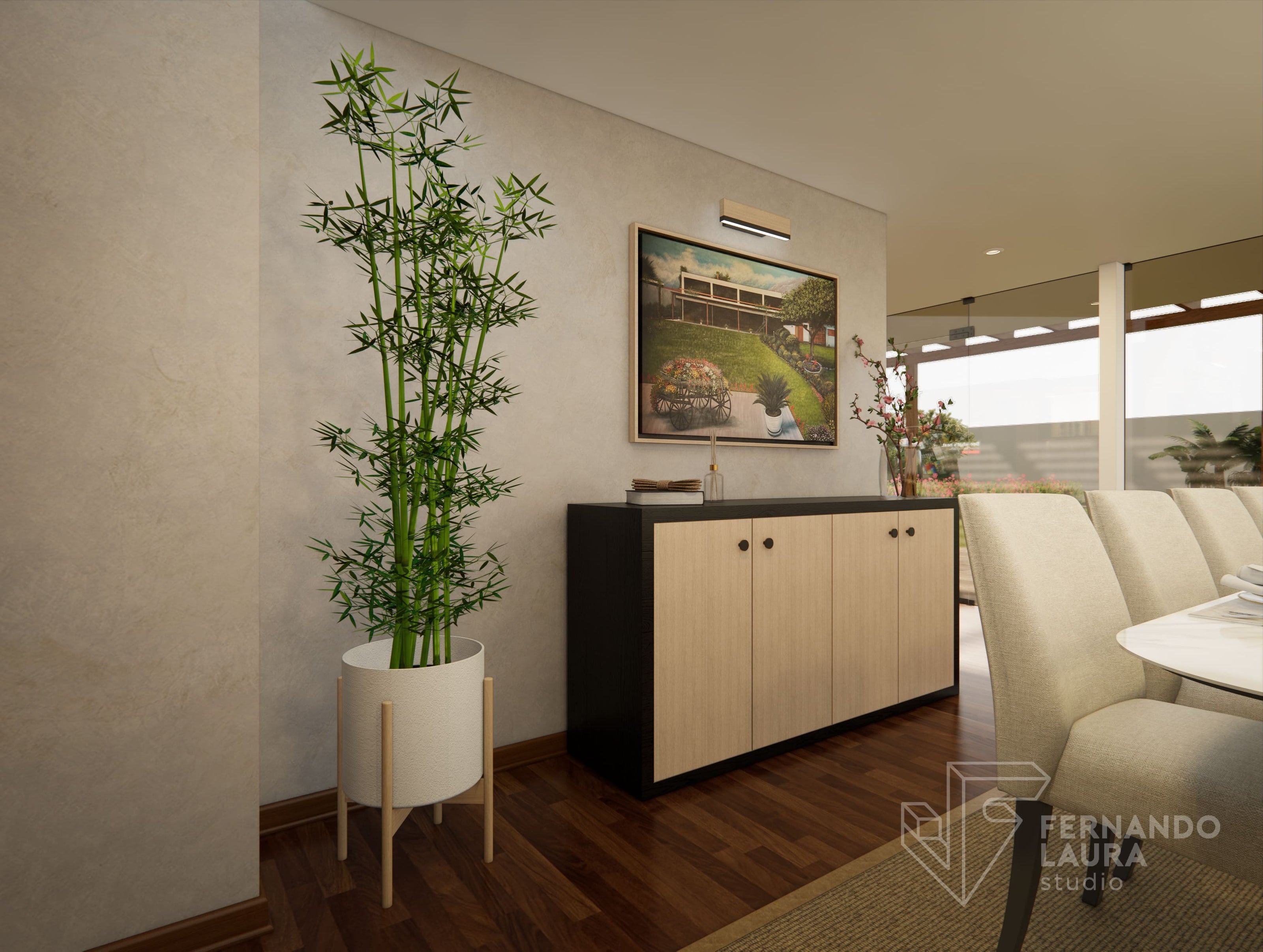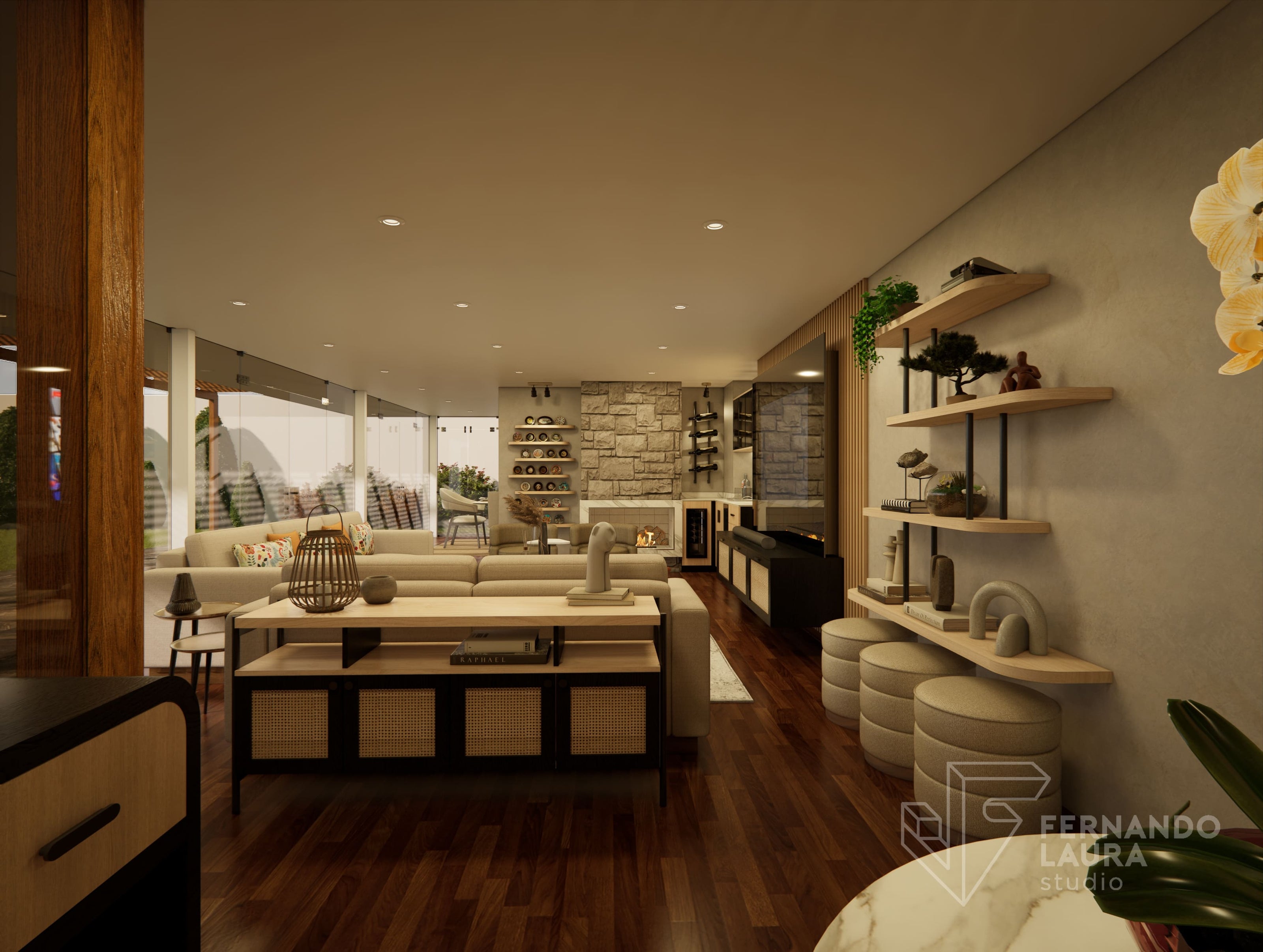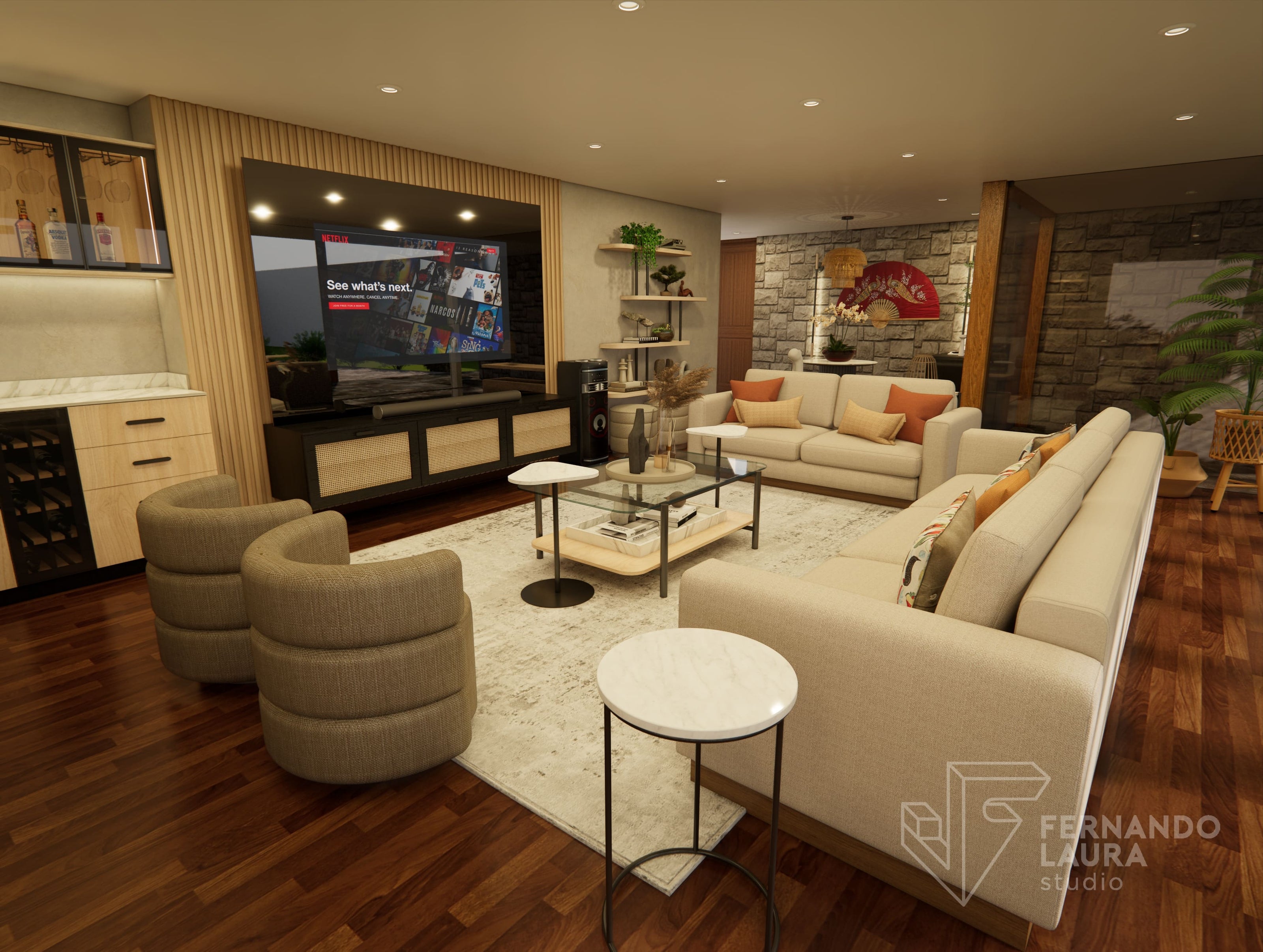 Trabajamos en una casa de campo en Lurigancho-Chosica, interviniendo un área de 79.90m² que abarcó los espacios de ingreso, sala y comedor. El diseño propuesto fue rústico moderno, utilizando una paleta de colores tierra, amaderados y negros para aportar elegancia y crear equilibrio visual con el piso existente y los acabados de piedra en las paredes. La decoración vibrante reflejó los viajes de la clienta alrededor del mundo.