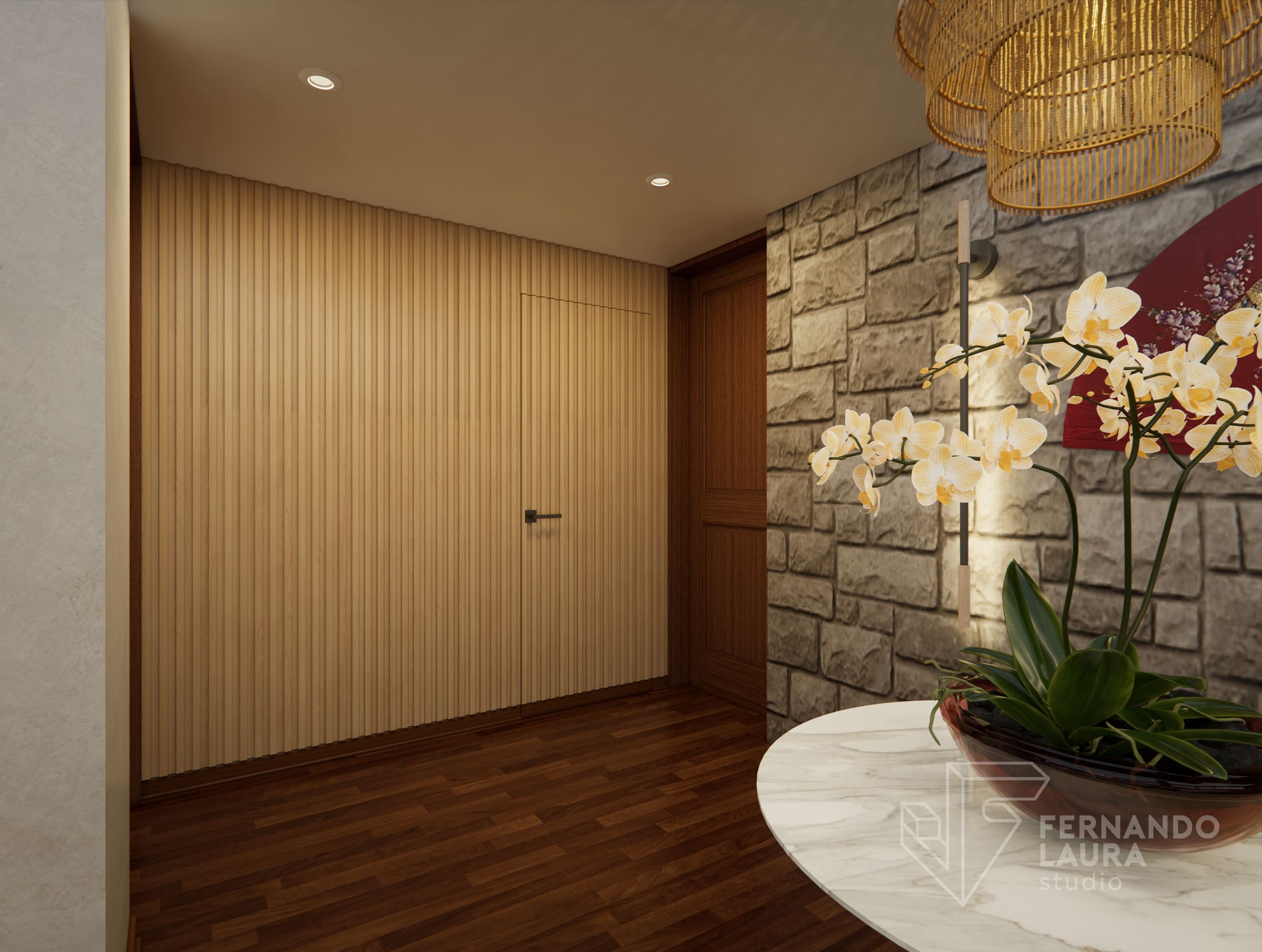 Para mejorar la entrada, el ingreso principal se trasladó a la puerta de la cochera. Ocultamos la puerta del baño de visitas con un panel de madera, añadimos una mesa circular de piedra sinterizada Calacatta Gold con base cilíndrica de madera porosa, una alfombra turca de acabado natural y una lámpara colgante diseñada por nuestro estudio como puntos focales. En la pared de piedra, sustituimos los apliques por otros de diseño propio que iluminaron la piedra, creando un interesante juego de luces y sombras, y colocamos un abanico de diseño junto a una consola de diseño frente a la mampara de vidrio, logrando una composición simétrica.