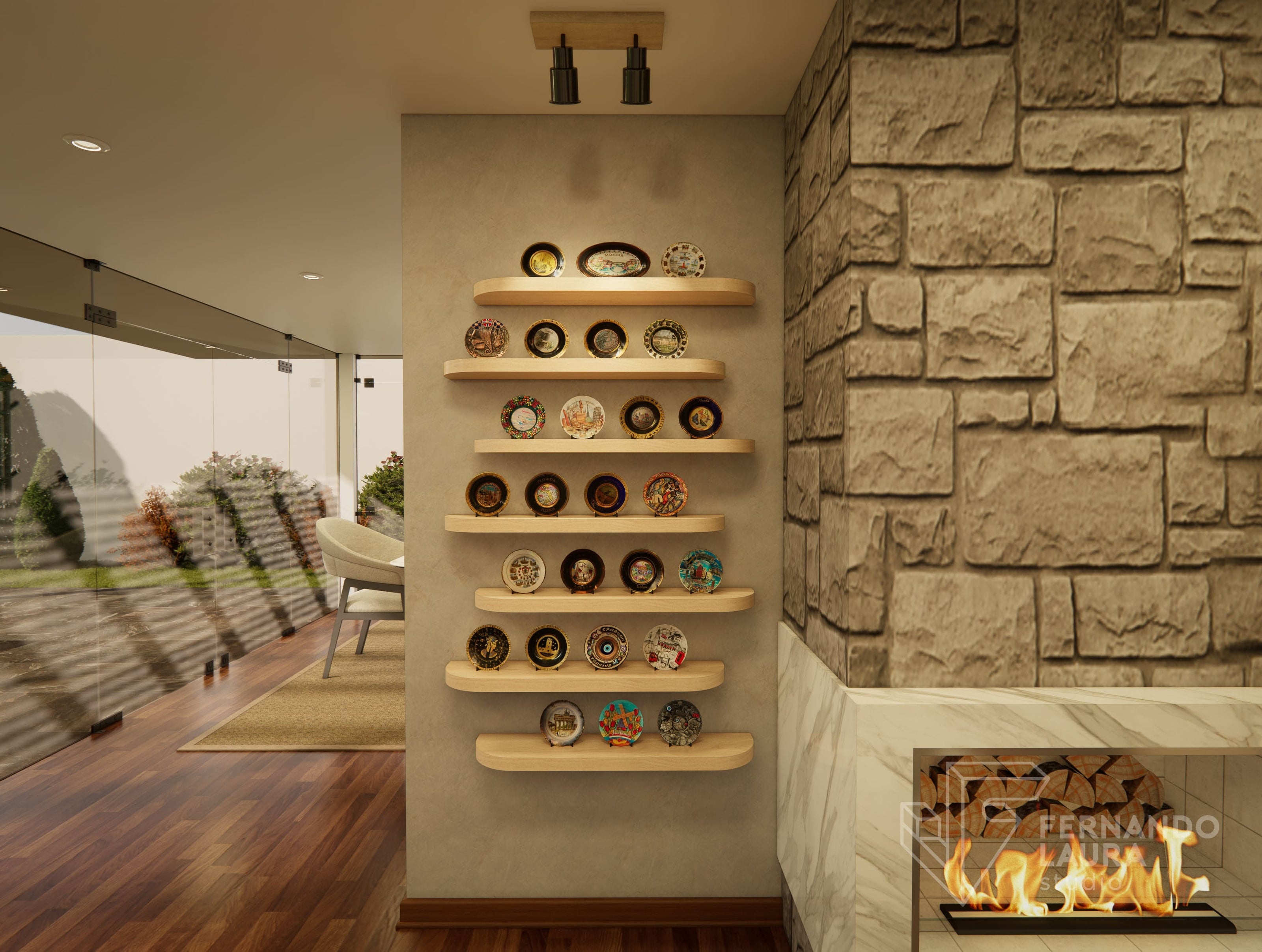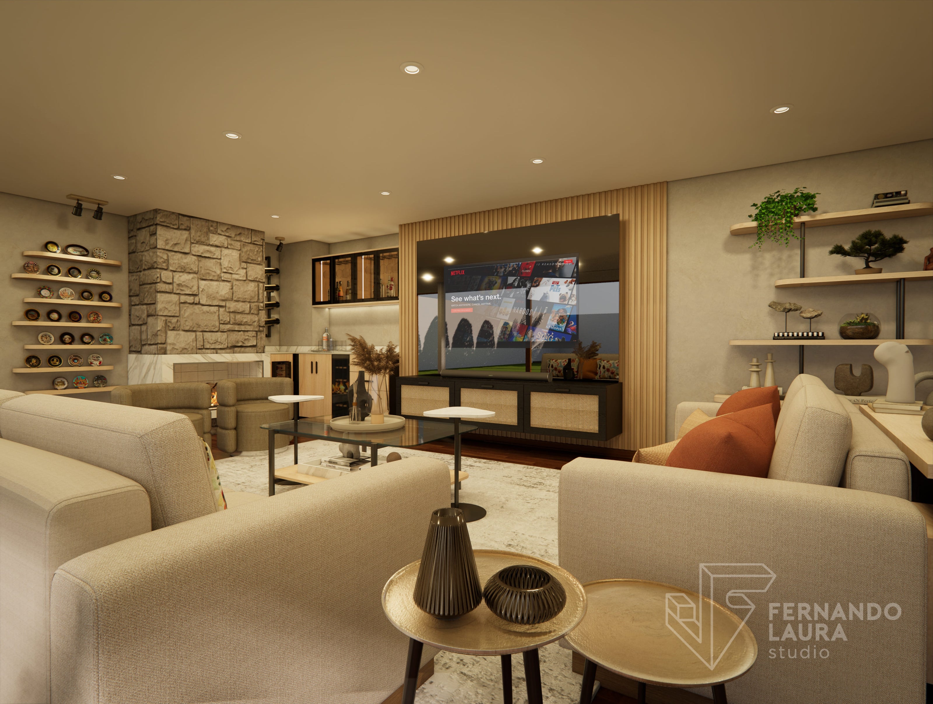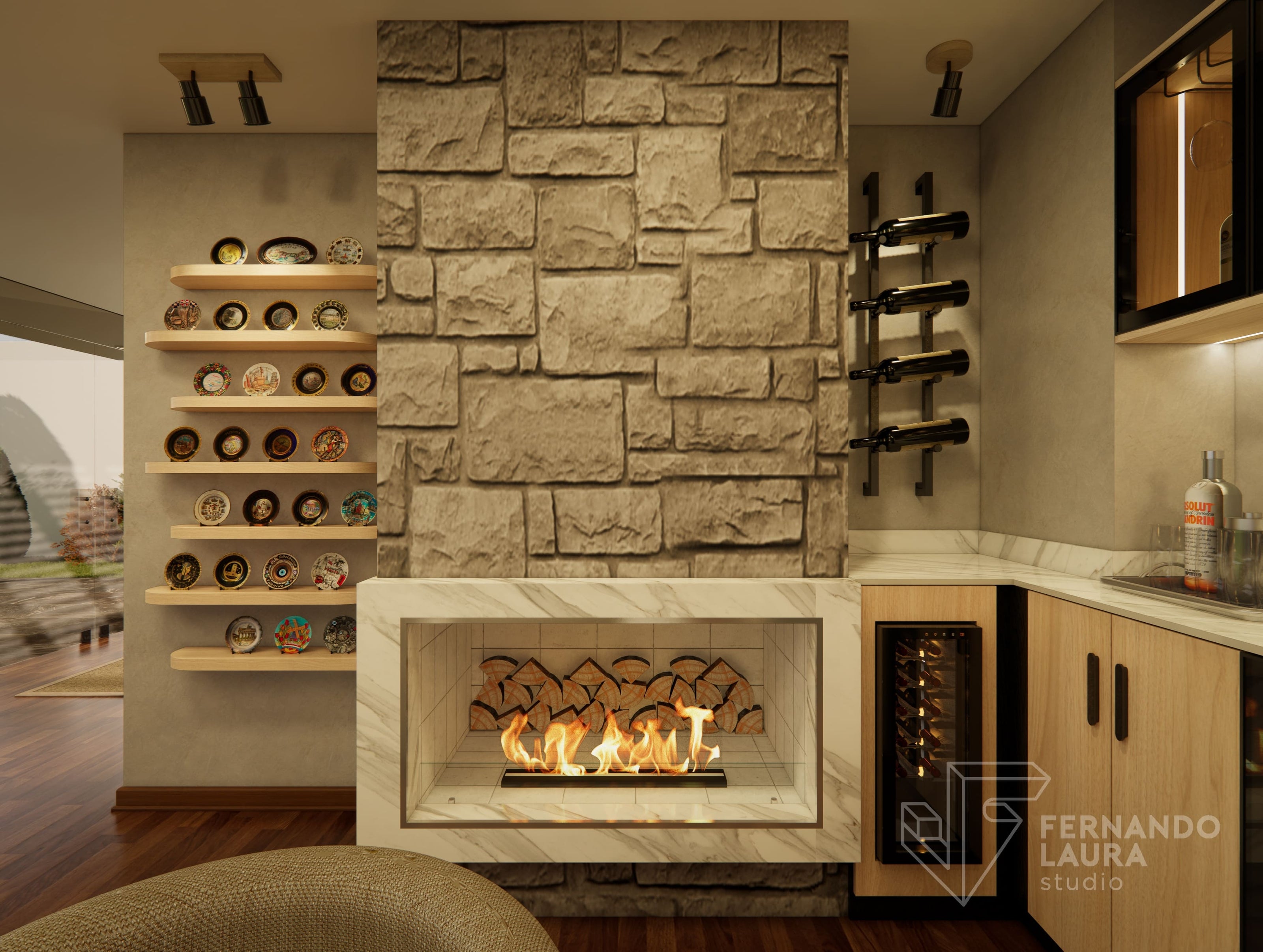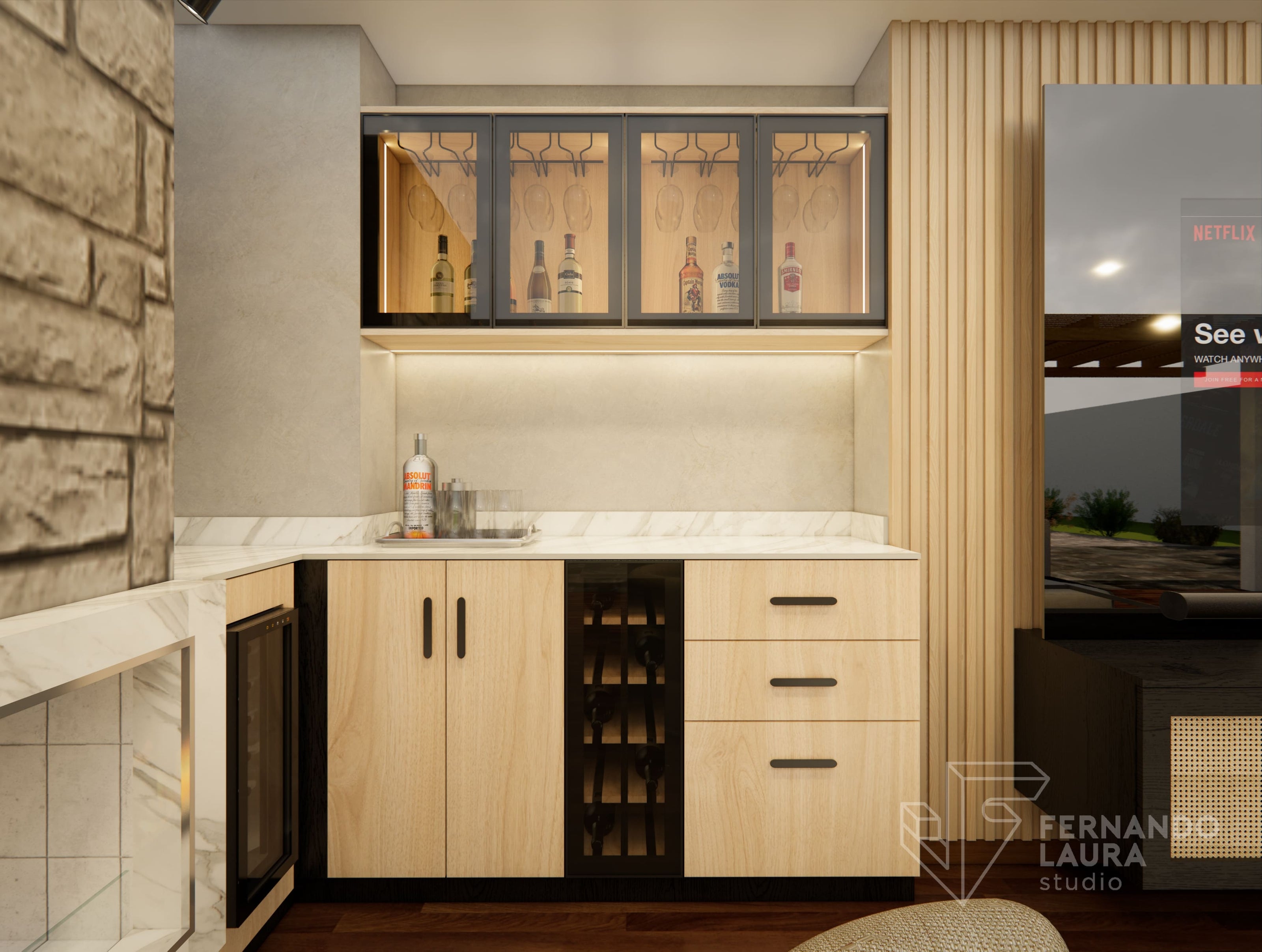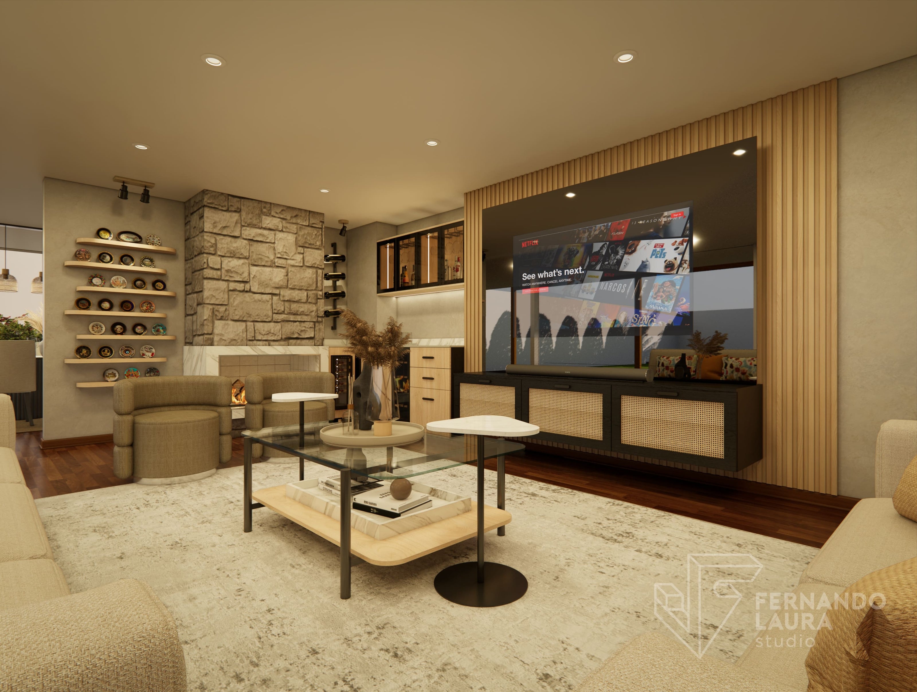 En la sala, una consola auxiliar con almacenamiento y puertas de ojo de perdiz complementó dos sofás seccionales en L y dos butacas, junto con puffs de diseño curvo y tapicería premium. Se aplicó un acabado de cemento quemado en la pared principal, sobre la cual instalamos repisas flotantes para exhibir piezas decorativas. Un panel de espejo con TV oculta fue elegido para mañanas de conversación y noches de cine en familia. En una esquina, se diseñó un mueble bar con la misma piedra sinterizada, integrando una vinera existente y almacenamiento adicional, además de un mueble alto con vidrio tintado retroiluminado para exhibir la variedad de bebidas. También se instalaron porta botellas iluminados y se reformó la chimenea, demoliendo los extremos para enchaparlos en piedra sinterizada y colocando repisas flotantes para exhibir platos decorativos de los países que ha visitado la clienta.