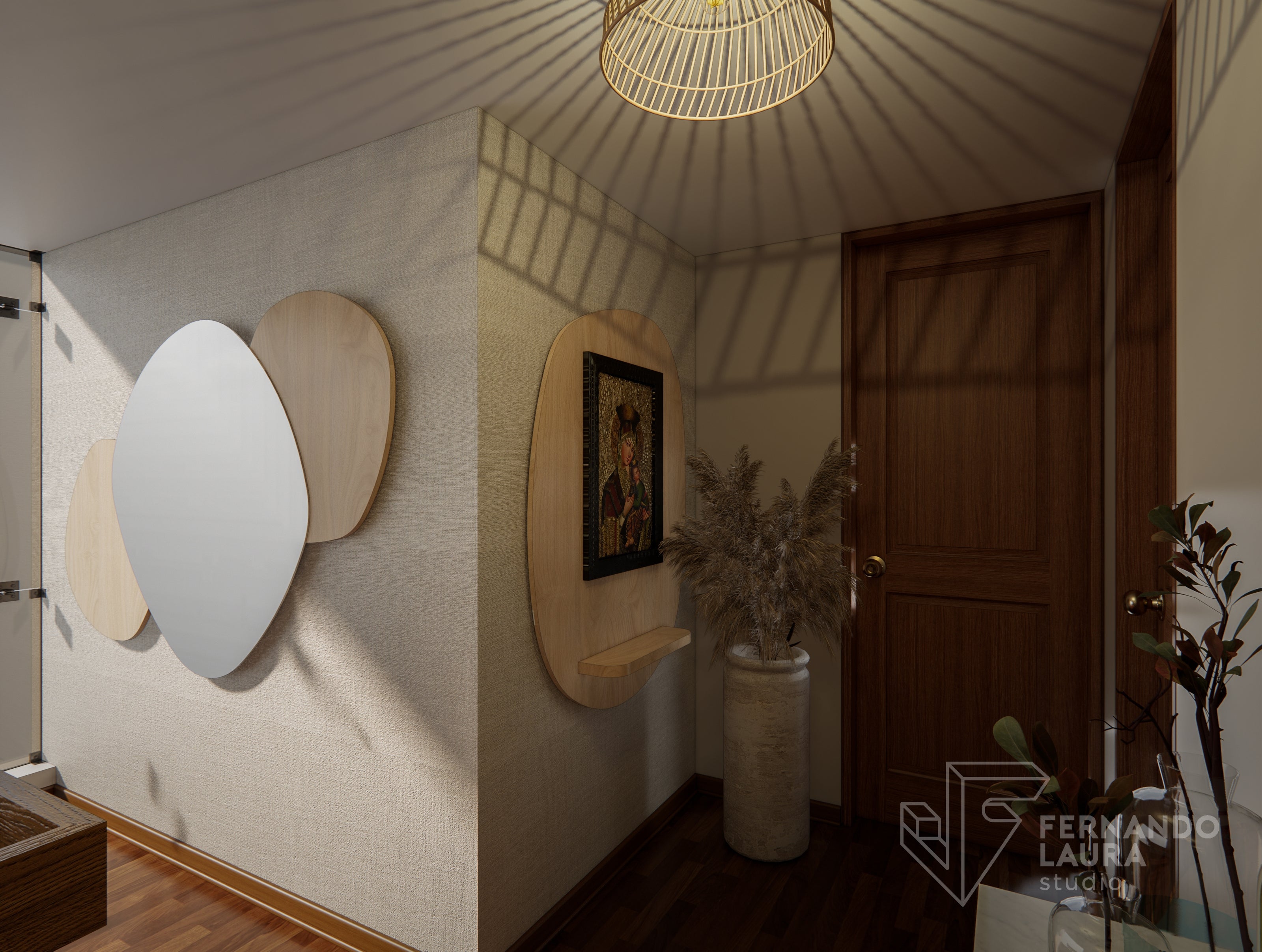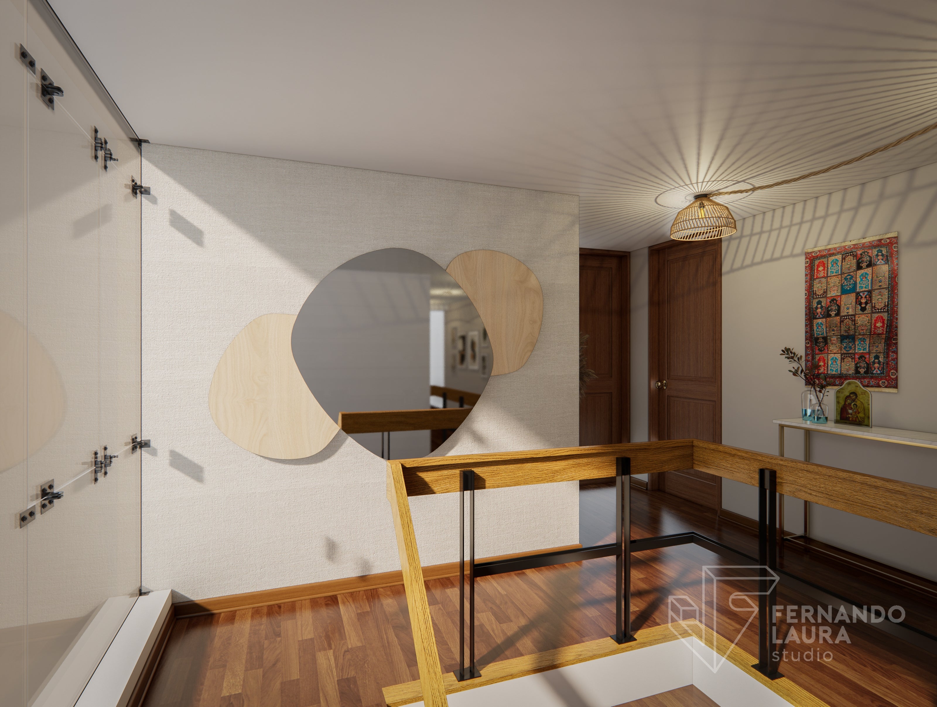 Se instaló un papel tapiz en la pared que recibe al subir las escaleras, acompañado de un conjunto de tres figuras orgánicas de madera y un espejo central. Además, se añadió una consola de mármol blanco y una decoración en la pared cuidadosamente seleccionada para destacar en el entorno neutral. En el pasadizo, se aplicó un acabado de pintura color greige, que sirve como base para la instalación de cuadros con fotos en alta definición de plantas y arte abstracto, aportando carácter y personalidad al espacio.