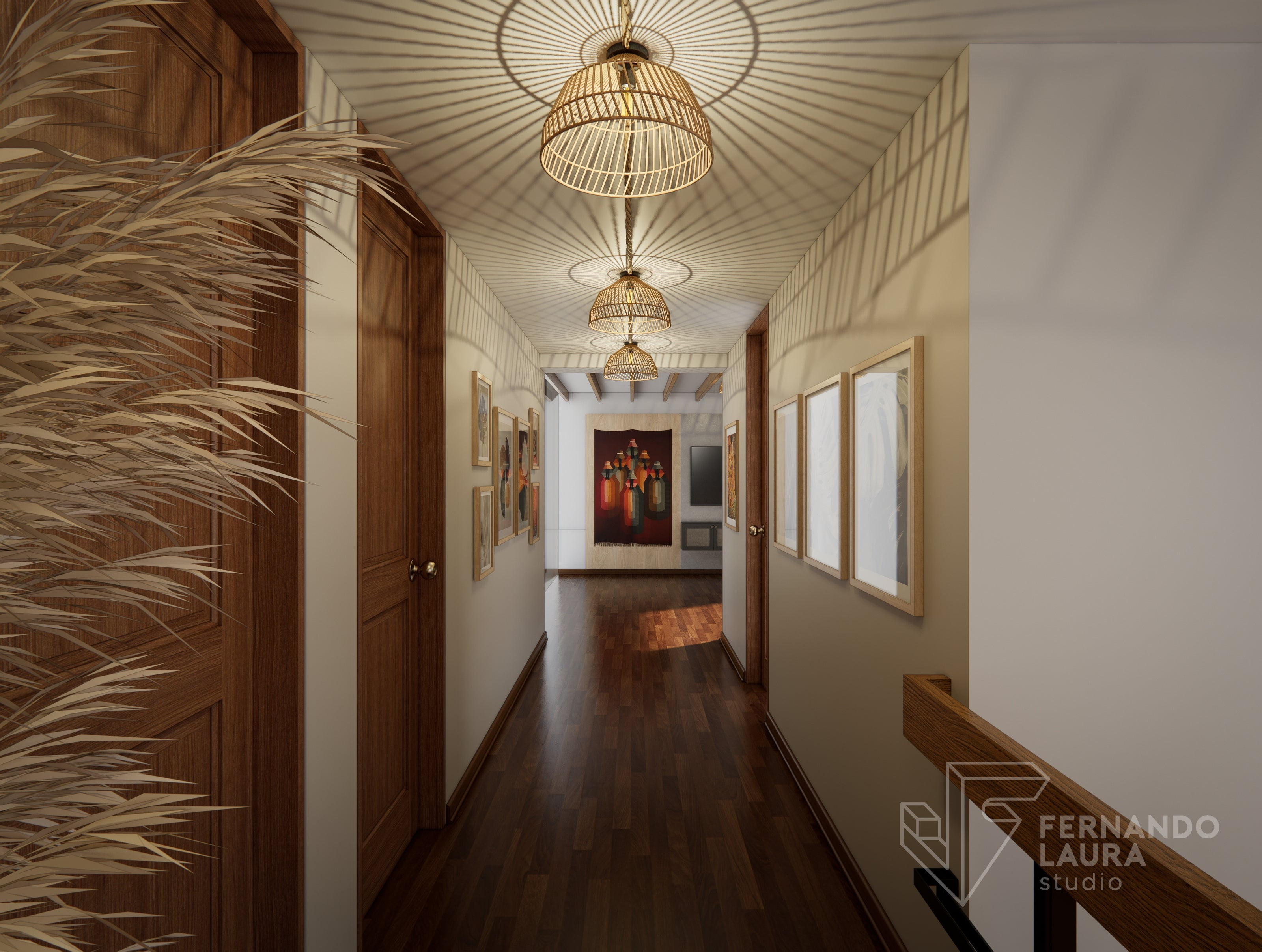 En la segunda etapa del proyecto de la casa de campo en Lurigancho-Chosica, nos enfocamos en el hall del segundo piso, abarcando todo el recorrido hacia las habitaciones y parte de la sala de estar. Manteniendo el estilo rústico moderno, se propuso un diseño con una intervención mínima en acabados.